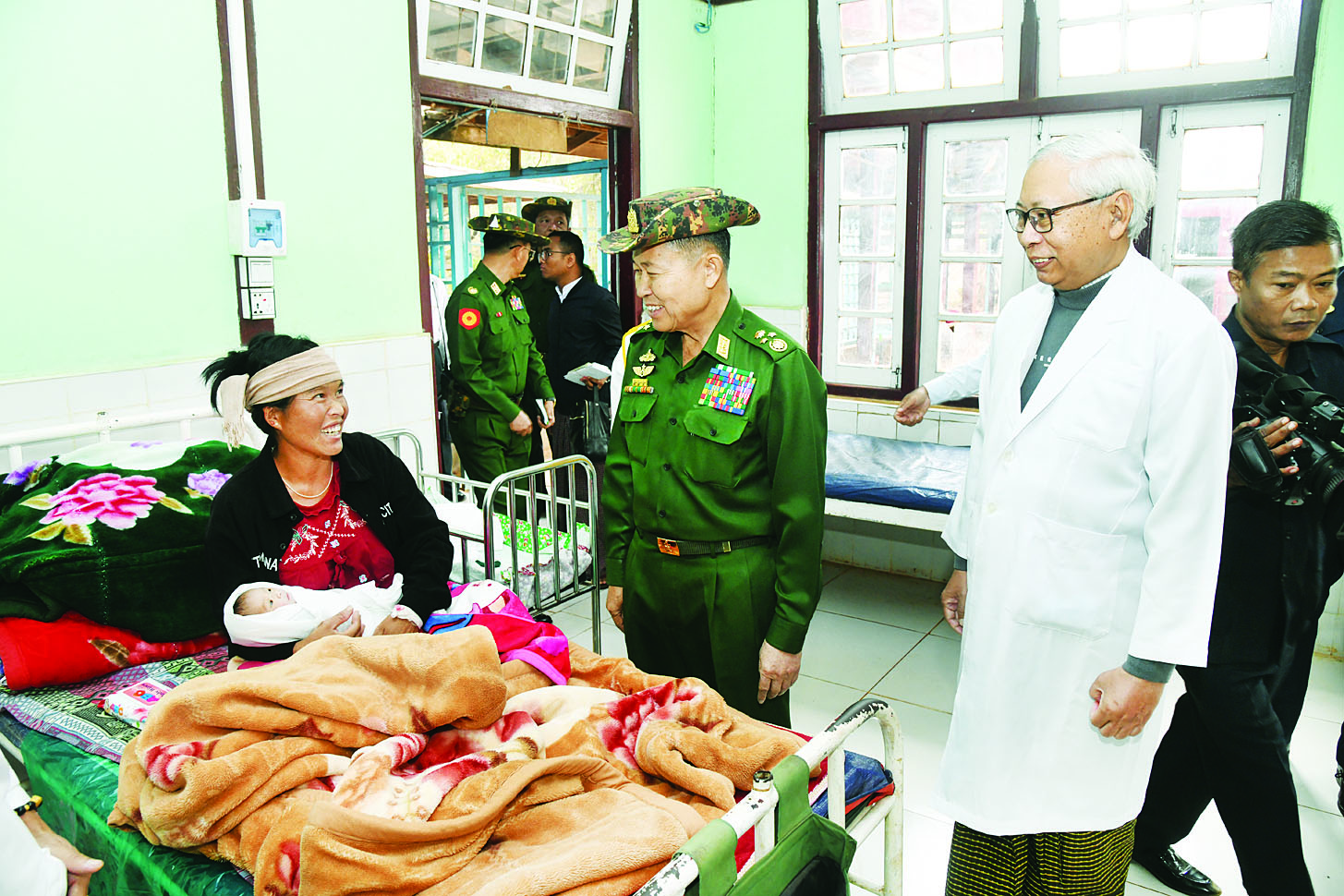 ဆက်လက်၍ နိုင်ငံတော်လုံခြုံရေးနှင့်အေးချမ်းသာယာရေးကော်မရှင်ဒုတိယဥက္ကဋ္ဌ ဒုတိယတပ်မတော်ကာကွယ်ရေးဦးစီးချုပ် ကာကွယ်ရေးဦးစီးချုပ် (ကြည်း)နှင့် အဖွဲ့ဝင်များသည် ဆေးရုံတက်ရောက်ဆေးကုသမှုခံယူလျက်ရှိသည့် ဒေသခံပြည်သူများအား လိုက်လံကြည့်ရှုပြီး တစ်ဦးချင်း၏ ရောဂါဖြစ်ပွားမှု၊ ကျန်းမာရေးတိုးတက်ကောင်းမွန်မှုအခြေအနေများကို လိုက်လံမေးမြန်းအားပေးစကား ပြောကြားကာ စားသောက်ဖွယ်ရာများ ပေးအပ်သည်။
