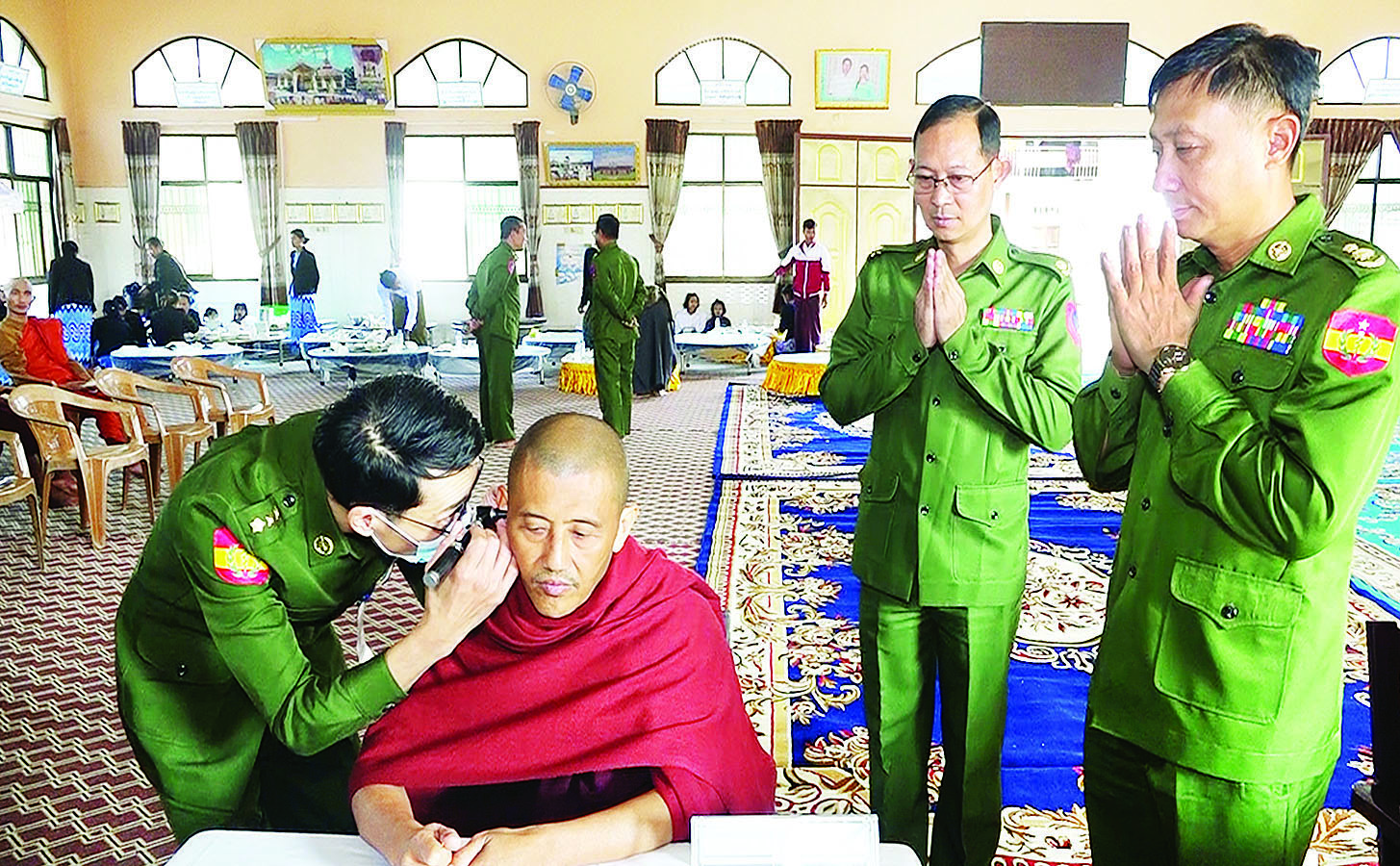 ထိုသို့ ဆောင်ရွက်ပေးလျက်ရှိရာ ယနေ့တွင် မြောက်ပိုင်းတိုင်းစစ်ဌာနချုပ် နယ်လှည့်ဆေးကုသရေးအဖွဲ့က ကချင်ပြည်နယ်မြစ်ကြီးနားမြို့ရှိ အံတော်ရှင်တောင်တန်းသာသနာပြု (ဗဟို) ကျောင်းတိုက်၌ အခြေပြု၍ မြစ်ကြီးနားမြို့ရှိ သံဃာတော်အပါး ၃၀ တို့ကို ခွဲစိတ်ကုသမှုဆိုင်ရာရောဂါ၊ အရိုးအကြောရောဂါ၊ အာရုံကြောအားနည်းရောဂါ၊ အထွေထွေရောဂါတို့နှင့် ပတ်သက်၍ ဆေးဝါးကုသခြင်း၊ ECG စက်ဖြင့် နှလုံးစမ်းသပ်စစ်ဆေးခြင်းနှင့် ဓာတ်မှန်ရိုက်ကူး၍ ရောဂါရှာဖွေပေးခြင်းများ ဆောင်ရွက်ပေးပြီး ဆေးရုံတက်ရောက်ကုသရန်လိုအပ်သော သံဃာတော်များအား မြစ်ကြီးနားမြို့ရှိ တပ်မတော်ဆေးရုံသို့ တက်ရောက်ကုသနိုင်ရေးဆောင်ရွက်ပေးသည်။