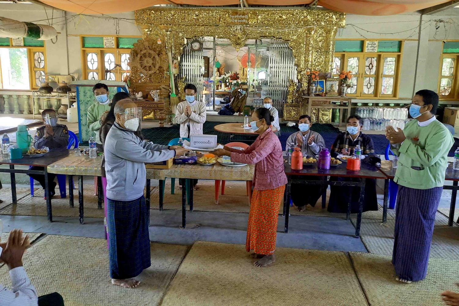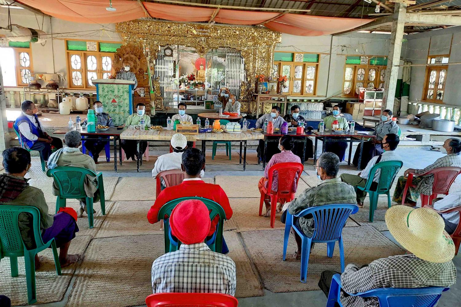 ရှေးဦးစွာ မကွေးတိုင်းဒေသကြီးအစိုးရအဖွဲ့ ဝန်ကြီးချုပ် ဒေါက်တာအောင်မိုးညိုနှင့် တာဝန်ရှိသူများ အဖွဲ့သည်  ဧရာဝတီမြစ်ကမ်းပါး ပြိုကျမှုကြောင့် ဘေးလွတ်ရာသို့ ပြောင်းရွှေ့ရသော အိမ်ထောင်စုများအတွက် မြေနေရာရရှိရေး စီစဉ်ဆောင်ရွက်ထားရှိမှုများကို ကြည့်ရှုစစ်ဆေးသည်။ ဆက်လက်၍ အခမ်းအနားကို ကျင်းပရာ မကွေးတိုင်းဒေသကြီးဝန်ကြီးချုပ် ဒေါက်တာအောင်မိုးညို က ဧရာဝတီမြစ်ကမ်းပါးပြိုကျမှုကြောင့် ပြောင်းရွှေ့ရသော အိမ်ထောင်စုများ အဆင်ပြေစွာ နေထိုင်နိုင်ရေး အိမ်ဝိုင်းမြေနေရာ ဝယ်ယူရန်အတွက် ထောက်ပံ့ငွေများ လာရောက်ပေးခြင်း ဖြစ်ပါကြောင်း၊ နိုင်ငံတော်အစိုးရအနေဖြင့် ကျေးလက်နေပြည်သူများ လူမှုစီးပွားဘဝ ဘက်စုံဖွံ့ဖြိုးတိုးတက်ရေးအတွက် ကြိုးပမ်းအကောင်အထည်ဖော် ဆောင်ရွက်လျက် ရှိပါကြောင်း၊ ယခုအချိန်အခါသည် ကိုဗစ် - ၁၉ ရောဂါဖြစ်ပွားနေသည့်ကာလဖြစ်၍ ပြည်သူများအနေဖြင့် ရောဂါကူးစက်ပြန့်ပွားမှု မဖြစ်စေရေး နိုင်ငံတော်မှ ထုတ်ပြန်ထားရှိသော ကိုဗစ် - ၁၉ ရောဂါကြိုတင်ကာကွယ်ရေးလုပ်ငန်းများကို အလေးထားလိုက်နာ နေထိုင်သွားကြစေလိုကြောင်း ဆွေးနွေးပြောကြားသည်။