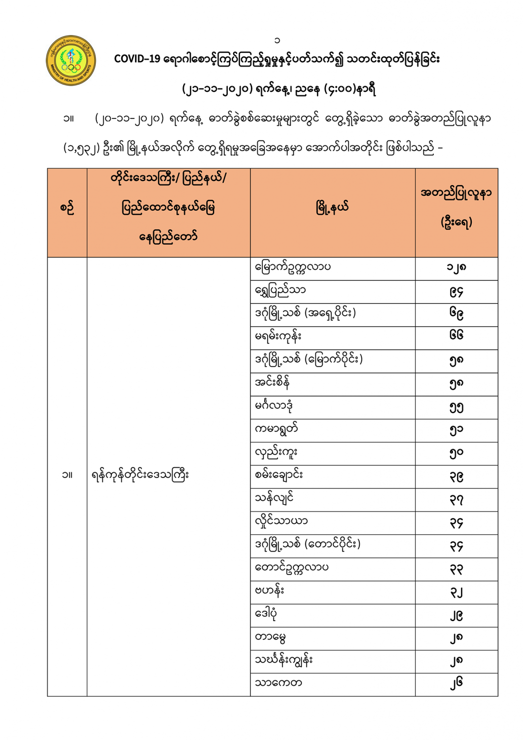COVID-19 ရောဂါစောင့်ကြပ်ကြည့်ရှုမှုနှင့်ပတ်သက်၍ သတင်းထုတ်ပြန်ခြင်း(၂၁-၁၁-၂၀၂၀) ရက်နေ့၊ ညနေ (၄:၀၀)နာရီ