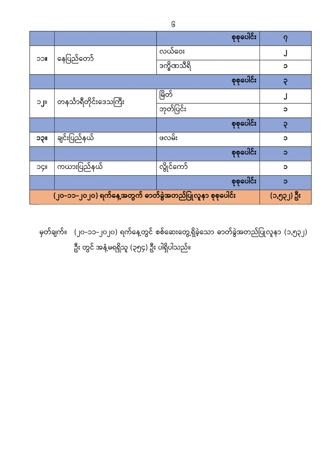 (၂၀-၁၁-၂၀၂၀) ရက်နေ့ ဓာတ်ခွဲစစ်ဆေးမှုများတွင် တွေ့ရှိခဲ့သော ဓာတ်ခွဲအတည်ပြုလူနာ (၁,၅၃၂) ဦး၏ မြို့နယ်အလိုက် တွေ့ရှိရမှုအခြေအနေမှာ အောက်ပါအတိုင်း ဖြစ်ပါသည်။