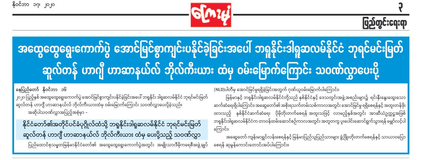 နောင်ကာလတွင်လည်း နိုင်ငံ၏ ပြုပြင် ပြောင်းလဲမှု၊ အစိုးရဌာနအသီးသီးတို့၏ ဆောင်ရွက်မှု၊ ပြည်သူတို့၏ လူမှု၊ စီးပွားဘဝ ဖြတ်သန်းမှု စသည့်အမျိုးမျိုးသော သတင်း အချက်အလက်များကို ပေးအပ်ရန်အတွက် စာဖတ်ပရိသတ်ပြည်သူများ အားပေးလက်ခံ သည့်နေ့ရက်များအထိ ဆက်လက်ရပ်တည် နိုင်မည်ဟု မျှော်လင့်မိပါကြောင်း ရေးသားတင်ပြလိုက်ရပါသည်။