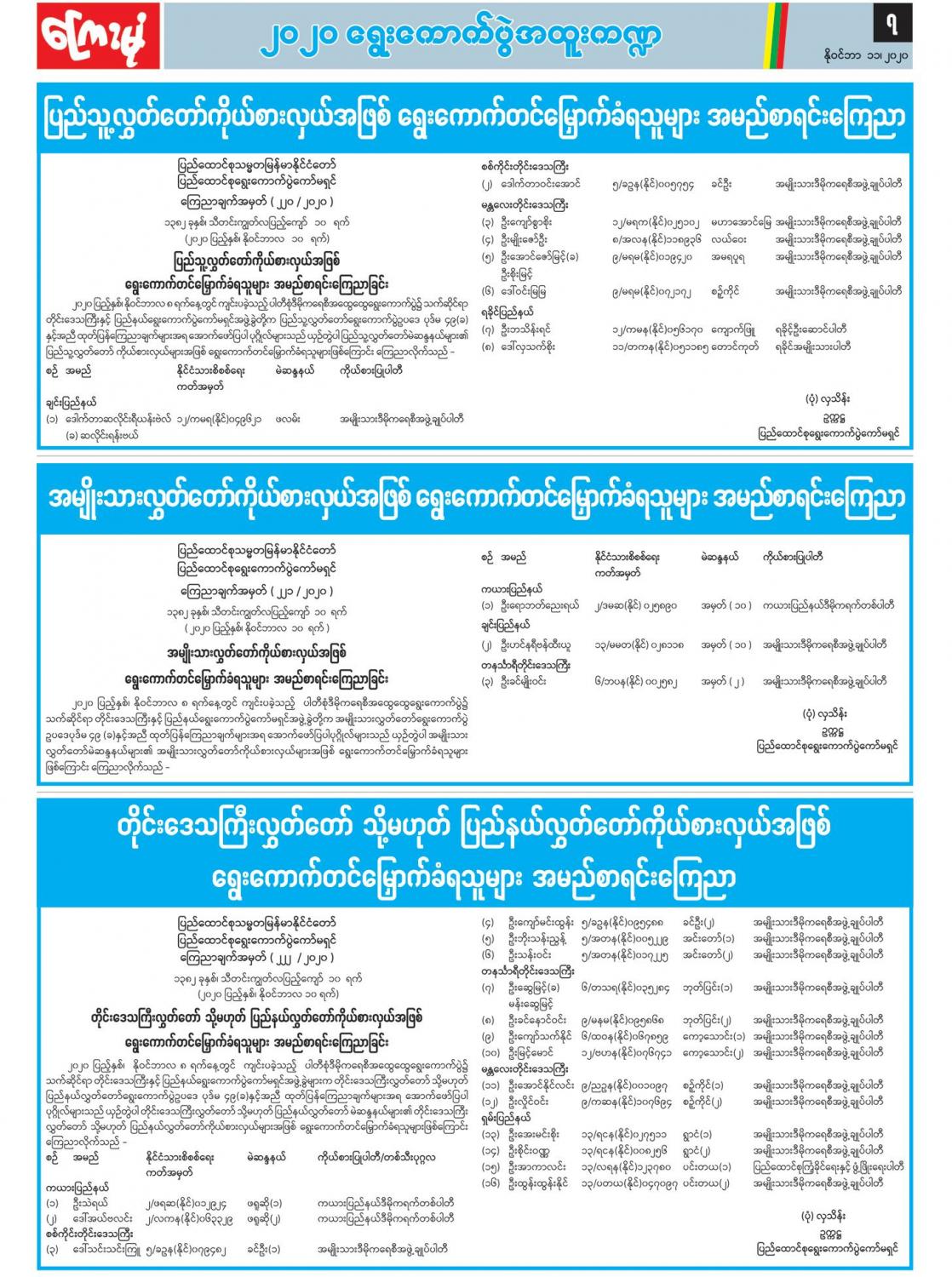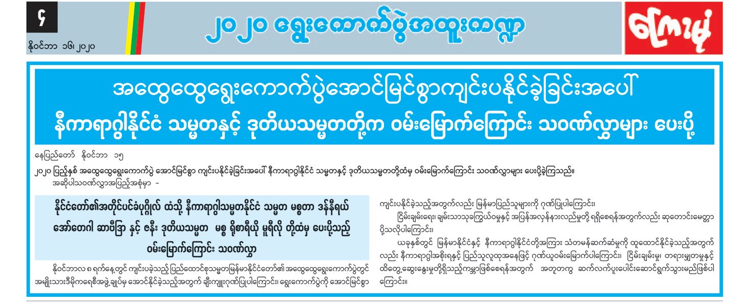 ၂၀၂၀ ပြည့်နှစ် ပါတီစုံဒီမိုကရေစီ အထွေထွေရွေးကောက်ပွဲကြီးမှာ ယခုအခါ အောင်အောင်မြင်မြင်ဖြင့် ပြီးဆုံးသွားခဲ့ပြီ ဖြစ်ပါသည်။ ပြည်သူများက ဆန္ဒမဲတစ်ပြားစီ ဖြင့် ထုတ်ဖော်ရွေးချယ်ခဲ့ကြသည့် လွှတ်တော် အသီးသီးမှ ပြည်သူ့ကိုယ်စားလှယ်များလည်း ထွက်ပေါ်လာခဲ့ပြီ ဖြစ်ပါသည်။ မိမိတို့ သတင်းစာများသည် ပါတီစုံဒီမိုကရေစီ အထွေထွေရွေးကောက်ပွဲကြီးအတွက် တာဝန် ကျေပွန်ခဲ့ပါပြီ။
