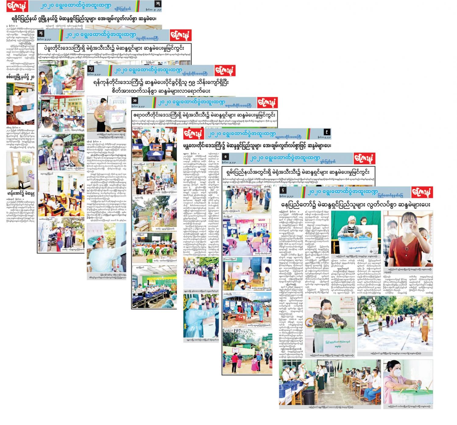 အများပြည်သူတို့ ဆန္ဒမဲပေးကြသည့် နေ့ရက်တွင် အနယ်နယ်အရပ်ရပ်မှ ပေးပို့ လာသည့် သတင်းထောက်များ၏ ရွေးကောက်ပွဲမြင်ကွင်း သတင်းများ ကို ရွေးချယ်၍ ပြည်ထောင်စုနယ်မြေ၊ တိုင်းဒေသကြီးနှင့် ပြည်နယ်များအလိုက် တစ်နိုင်ငံလုံးမှ ရွေးကောက်ပွဲ သတင်းပုဒ်ရေ ၃၀ ကျော်၊ သတင်းဓာတ်ပုံမြင်ကွင်း စာမျက်နှာ ငါးမျက်နှာခန့်နှင့် ပြည်ထောင်စုရွေးကောက်ပွဲကော်မရှင်၏ အသိပေးချက် များ စသည်တို့ကို ဖော်ပြပေးခဲ့ပါသည်။ ယင်းနေ့ နိုဝင်ဘာ ၉ ရက်ထုတ် သတင်း စာမျက်နှာ အများအပြားကို ရွေးကောက်ပွဲနှင့် သက်ဆိုင်သည့် သတင်းများ ဖော်ပြပေး နိုင်ခဲ့သည့် အခြေအနေပင်ဖြစ်ပါသည်။