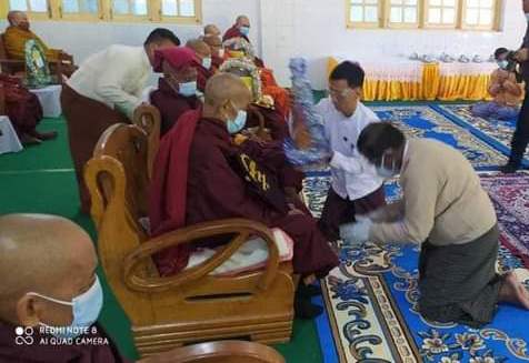 ဆက်လက်၍ မန္တလေးတိုင်းဒေသကြီးအစိုးရအဖွဲ့ ဝန်ကြီးချုပ် ဒေါက်တာဇော်မြင့်မောင်နှင့် အစိုးရအဖွဲ့ဝင် ဝန်ကြီးများ၊ လွှတ်တော်ကိုယ်စားလှယ်များမှ ဆရာတော်ကြီးများအား သင်္ကန်းနှင့်လှူဘွယ် ဝတ္ထုပစ္စည်းများကို ဆပ်ကပ်လှူဒါန်း ခဲ့ကြရာ မြို့နယ်သံဃနာယက အဖွဲ့ဥက္ကဋ္ဌ၊ ကုန်းမြင့်သာ ကျောင်းတိုက်ဆရာတော် ဘဒ္ဒန္တ စက္ကိန္ဒာဘိဓဇ အရှင်သူမြတ် ကြီးက လှူဒါန်းမှု အစုစုအတွက် ရေစက်သွန်းချတရား ချီးမြှင့်ပေးခဲ့ပြီး အခမ်းအနားကို ဗုဒ္ဓသာသနံစိရံ တိဋ္ဌတု သုံးကြိမ် ရွတ်ဆိုဆုတောင်းကာ ဆရာတော်ကြီးများအား နေ့ဆွမ်းဆက်ကပ်ခဲ့ကြောင်း သိရသည်။