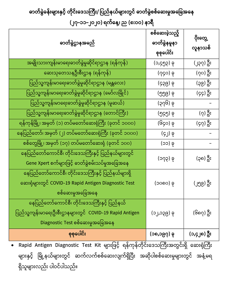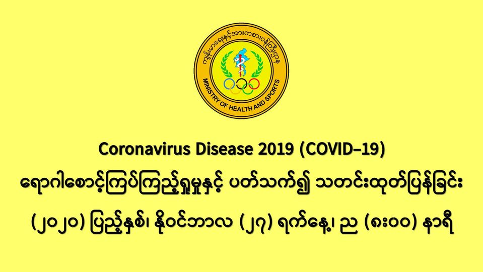 (၂၆-၁၁-၂၀၂၀) ရက်နေ့၊ ည (၈:၀၀) နာရီမှ (၂၇-၁၁-၂၀၂၀) ရက်နေ့၊ ည (၈:၀၀) နာရီ အတွင်း ဓာတ်ခွဲနမူနာ စုစုပေါင်း (၁၈,၁၉၇) ခုအား စစ်ဆေးပြီးစီးခဲ့ရာ COVID-19 ရောဂါ ဓာတ်ခွဲအတည်ပြု လူနာသစ် (၁,၄၂၈) ဦး တွေ့ရှိရပါသည်။