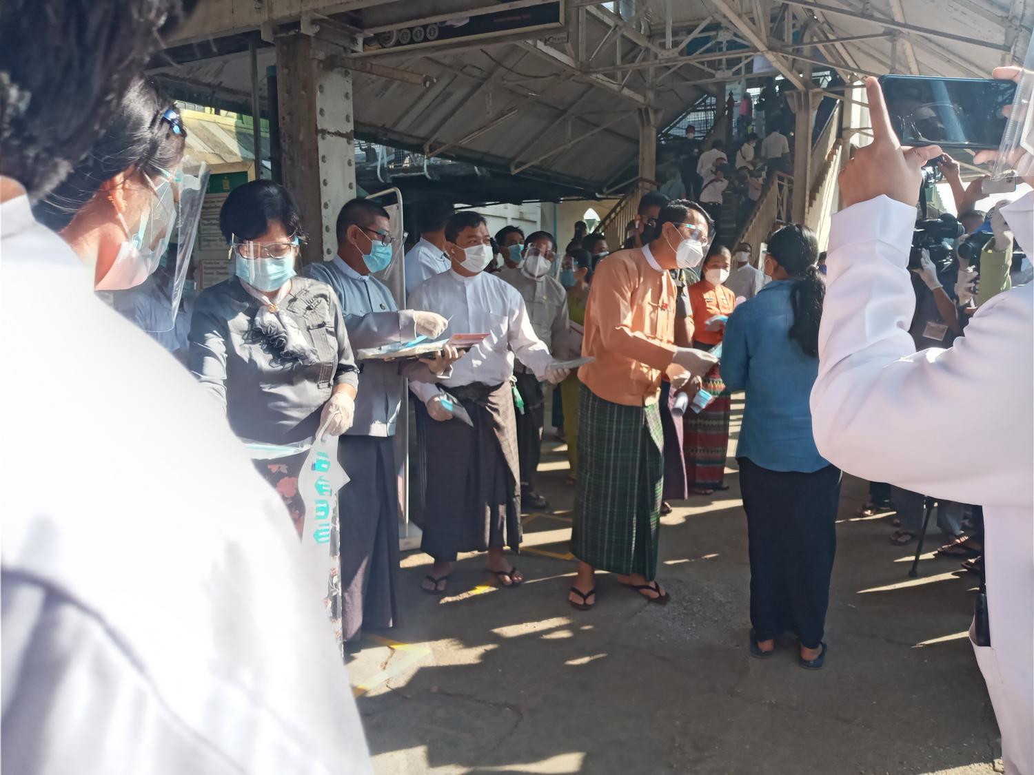 အဆိုပါ ကိုဗစ်-၁၉ ရောဂါကြိုတင်ကာကွယ်ရေးလုပ်ငန်းဖြစ်သည့် မီးရထားစီးပြည်သူများအား Mask များ အခမဲ့ဖြန့်ဝေပေးခြင်၊ လက်ကမ်းစာစောင်များ ဖြန့်ဝေပေးခြင်းများအား ရန်ကုန် တိုင်းဒေသကြီး အစိုးရအဖွဲ့ ဝန်ကြီးချုပ် ဦးဖြိုးမင်းသိန်းဦးဆောင်၍ အစိုးရအဖွဲ့ဝင်များ ၊ မြန်မာ့ မီးရထားလုပ်ငန်းမှ တာဝန်ရှိသူများ၊ YRTA မှ တာဝန်ရှိသူများ၊ အထွေထွေအုပ်ချုပ်ရေးဦးစီးဌာနမှ တာဝန်ရှိသူများ၊ ပြည်သူ့ကျန်းမာရေးဦးစီးဌာနမှတာဝန် ရှိသူများ၊ မြို့နယ် စည်ပင်သာယာရေး ကော်မတီ ဥက္ကဋ္ဌနှင့် အဖွဲ့ဝင်များ၊ မြို့နယ်ကိုဗစ်-၁၉ရောဂါ ထိန်းချုပ်ရေး နှင့် အရေးပေါ်တုံ့ပြန်ရေးကော်မတီဝင်များ၊ မြို့နယ်မီးသတ် တပ်ဖွဲ့ဝင်များ၊ မြို့နယ်ကြက်ခြေနီ တပ်ဖွဲ့ဝင်များနှင့် ရပ်ကွက်အုပ်ချုပ်ရေးမှူးများ ပူးပေါင်းပါဝင်ဆောင်ရွက်ပေးခဲ့ကြကြောင်း သိရသည်။