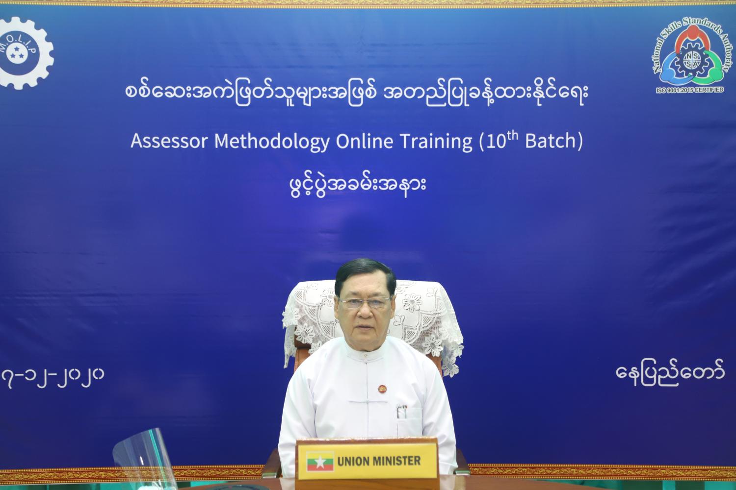 မြန်မာနိုင်ငံ လုပ်သားများ ကျွမ်းကျင်မှု “စံ” သတ်မှတ်ပြဋ္ဌာန်းရေးအဖွဲ့ (NSSA) ၏ စစ်ဆေး အကဲဖြတ်သူများအဖြစ် အတည်ပြု ခန့်ထားနိုင်ရေး Online ဖြင့် ပို့ချသော Assessor Methodology Online Training (10th Batch)ဖွင့်ပွဲအခမ်းအနားကို ယနေ့ နံနက် ၁၀ နာရီတွင် နေပြည်တော်ရှိ အလုပ်သမား၊ လူဝင်မှုကြီးကြပ်ရေးနှင့် ပြည်သူ့အင်အား ဝန်ကြီးဌာန အစည်း အဝေးခန်းမ၌ ဗီဒီယို ကွန်ဖရင့်စနစ်ဖြင့် ကျင်းပသည်။