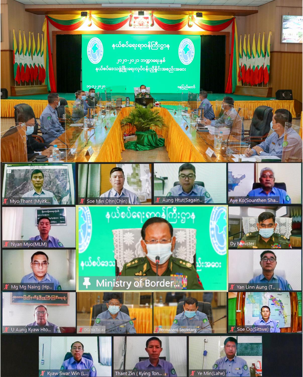 ထို့နောက် နယ်စပ်ဒေသနှင့် တိုင်းရင်းသားလူမျိုးများ ဖွံ့ဖြိုးတိုးတက်ရေးဦးစီးဌာန၊ ညွှန်ကြား ရေးမှူးချုပ်က လုပ်ငန်းဆောင်ရွက်နေမှုများကို ရှင်းလင်းတင်ပြပြီး သက်ဆိုင်ရာ လုပ်ငန်းဌာန၊ ညွှန်ကြားရေးမှူးများ၊ ပြည်နယ်/တိုင်းဒေသကြီး ဖွံ့ဖြိုးမှုကြီးကြပ်ရေးမှူးများက ၂၀၂၀-၂၀၂၁ ဘဏ္ဍာရေးနှစ် ဒေသဖွံ့ဖြိုးရေး တည်ဆောက်ရေးလုပ်ငန်းများအား ကိုဗစ်-၁၉ ဆိုင်ရာ လမ်းညွှန် ချက်များနှင့်အညီ အကောင်အထည်ဖော် ဆောင်ရွက်နေသည့် အခြေအနေများကို ဒေသ အလိုက် ရှင်းလင်းတင်ပြကြရာ ပြည်ထောင်စုဝန်ကြီး၊ ဒုတိယဝန်ကြီးနှင့် တာဝန်ရှိသူများက ပေါင်းစပ်ညှိနှိုင်း ဖြည့်ဆည်းဆောင်ရွက်ပေးခဲ့ကြောင်း သိရသည်။