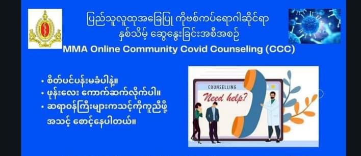 လူမှုဝန်ထမ်း၊ ကယ်ဆယ်ရေးနှင့် ပြန်လည်နေရာချထားရေးဝန်ကြီးဌာနနှင့် မြန်မာနိုင်ငံ ဆရာဝန်အသင်းတို့ ပူးပေါင်း၍ ပြည်သူလူထုအခြေပြု ကိုဗစ်ကပ်ရောဂါ ဆိုင်ရာ နှစ်သိမ့်ဆွေးနွေးခြင်းအစီအစဉ် (Online Community COVID Counselling-CCC) ကို ဆောင်ရွက်သွားမည်ဖြစ်ရာ လက်ရှိဝန်ဆောင်မှုပေးနေသည့် Hotline ဖုန်းများအနက်မှ ၀၉ - ၇၇၀ ၇၇၀ ၀၀၁ (Telenor)၊ ၀၉ - ၇၇၀ ၇၇၀ ၀၁၁ (Telenor)၊ ၀၉ - ၉၈၀ ၀၀၀ ၁၁၂ (Ooredoo)၊ ၀၉ - ၉၈၀ ၀၀၀ ၁၁၃ (Ooredoo) တယ်လီဖုန်းနံပါတ်များသို့ အခမဲ့ခေါ်ဆို၍ ဝန်ဆောင်မှု ရယူနိုင်ကြောင်းနှင့် နေ့စဉ်နံနက် ၉ နာရီမှ ည ၁၀ နာရီအထိ ဝန်ဆောင်မှု ပေးသွား မည်ဖြစ်ကြောင်း သိရသည်။