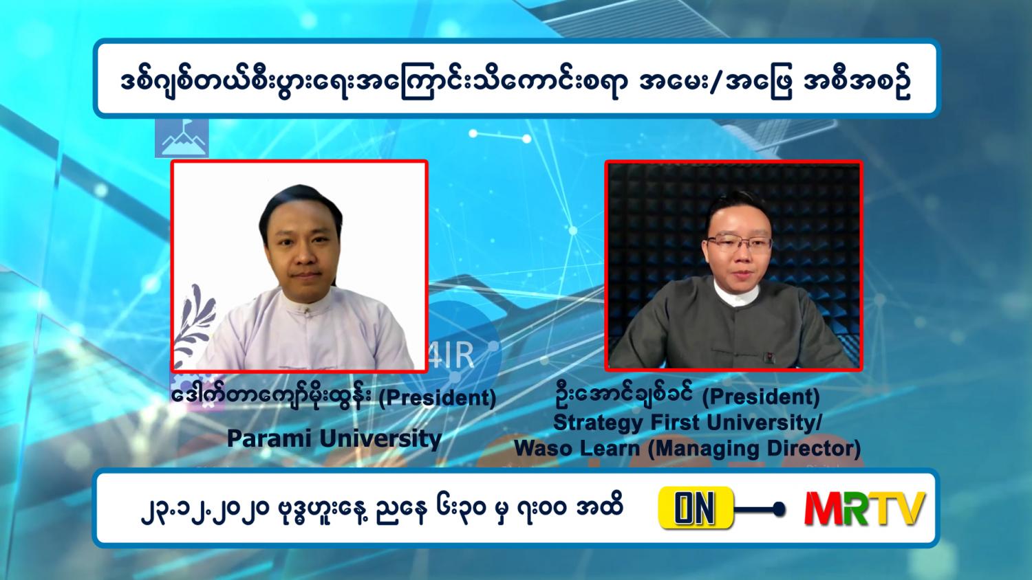 ဒီဇင်ဘာ ၂၃ ရက် (ဗုဒ္ဓဟူးနေ့)ညနေတွင် Digital အသွင်ကူးပြောင်းမှု၌ Digital နည်းပညာအသုံးပြုမှု ကျယ်ပြန့်လာပုံများ၊ ပညာရေးတွင် Digital စီးပွားရေး၏ အရေးပါပုံ များနှင့် ပတ်သက်ပြီး ဗဟုသုတမျှဝေပေးမည့် ဒစ်ဂျစ်တယ် စီးပွားရေးအကြောင်း သိကောင်းစရာ အစီအစဉ်အား Parami University (President) ဒေါက်တာ ကျော်မိုးထွန်းနှင့် Strategy First University မှ(President) Waso Learn မှ (Managing Director) ဦးအောင်ချစ်ခင် တို့က  ဆွေးနွေးကြမည်ဖြစ်ရာ အဆိုပါဆွေးနွေးချက်များကို ညနေ ၆ နာရီခွဲတွင် ထုတ်လွှင့် သွားမည်ဖြစ်ကြောင်း သိရသည်။