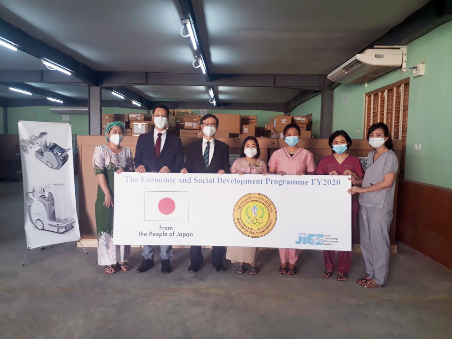အခမ်းအနားတွင် မြန်မာနိုင်ငံဆိုင်ရာ ဂျပန်သံရုံးမှ သံမှူး Mr. Takimi Kazuyuki က ကိုဗစ်-၁၉ ရောဂါကာကွယ်ထိန်းချုပ်ကုသရေးဆိုင်ရာ အထောက်အပံ့စီမံကိန်းအရ ဝယ်ယူ ထားသည့် ဆေးဘက်ဆိုင်ရာ အထောက်အကူပြု ပစ္စည်းကိရိယာများကို ကျန်းမာရေးနှင့် အားကစားဝန်ကြီးဌာန၊ ဗဟိုဆေးသိုလှောင်ရေးဌာနမှ ဒုတိယညွှန်ကြားရေးမှူး ဒေါက်တာ ခင်သီတာအေးနှင့် တာဝန်ရှိသူများထံ လွှဲပြောင်းပေးအပ်သည်။
