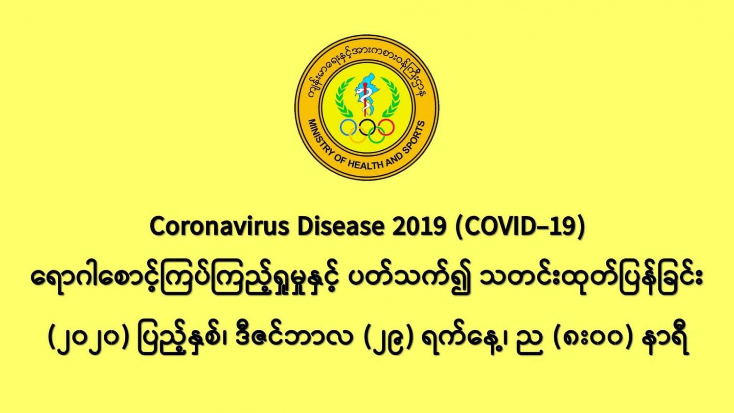 COVID-19 ရောဂါစောင့်ကြပ်ကြည့်ရှုမှုနှင့်ပတ်သက်၍ သတင်းထုတ်ပြန်ခြင်း 12/29/2020 (၂၉-၁၂-၂၀၂၀) ရက်နေ့၊ ည (၈:၀၀)နာရီ (၂၈-၁၂-၂၀၂၀) ရက်နေ့၊ ည (၈:၀၀) နာရီမှ (၂၉-၁၂-၂၀၂၀) ရက်နေ့၊ ည (၈:၀၀) နာရီ အတွင်း ဓာတ်ခွဲနမူနာ စုစုပေါင်း (၁၈,၀၉၈) ခုအား စစ်ဆေးပြီးစီးခဲ့ရာ COVID-19 ရောဂါ ဓာတ်ခွဲအတည်ပြု လူနာသစ် (၆၁၉) ဦး တွေ့ရှိရပါသည်။ #Ministry_of_Health_and_Sports, #MoHS, #COVID19LabResults, #ကိုရိုနာဗိုင်းရပ်စ်, #ဓာတ်ခွဲအဖြေ