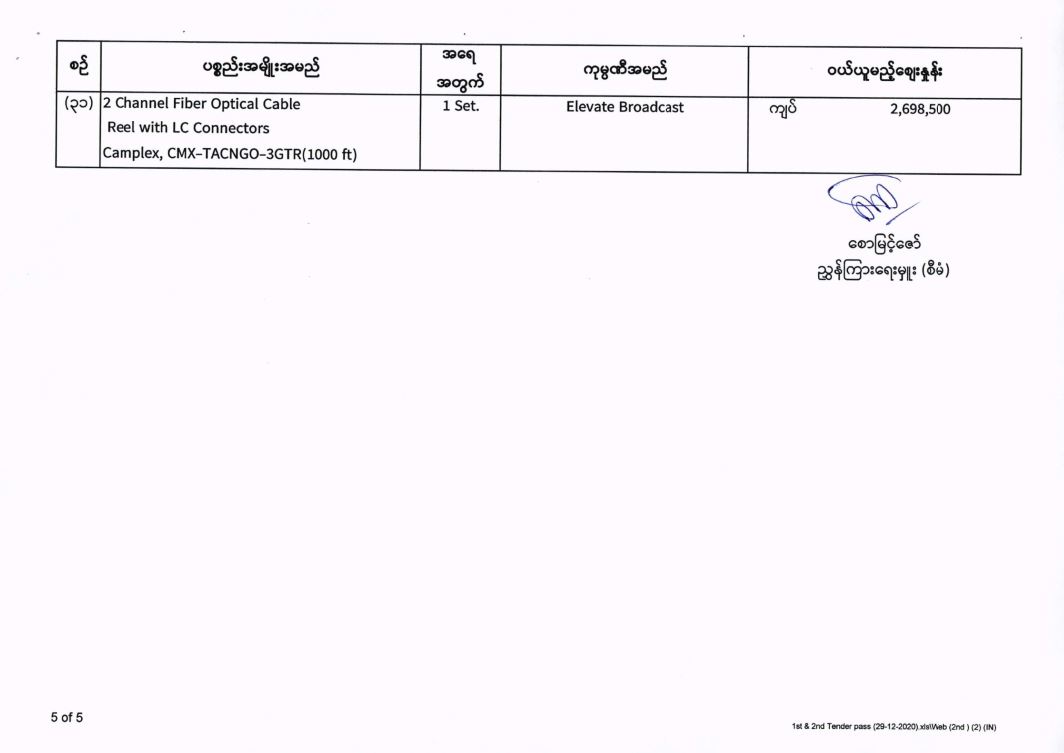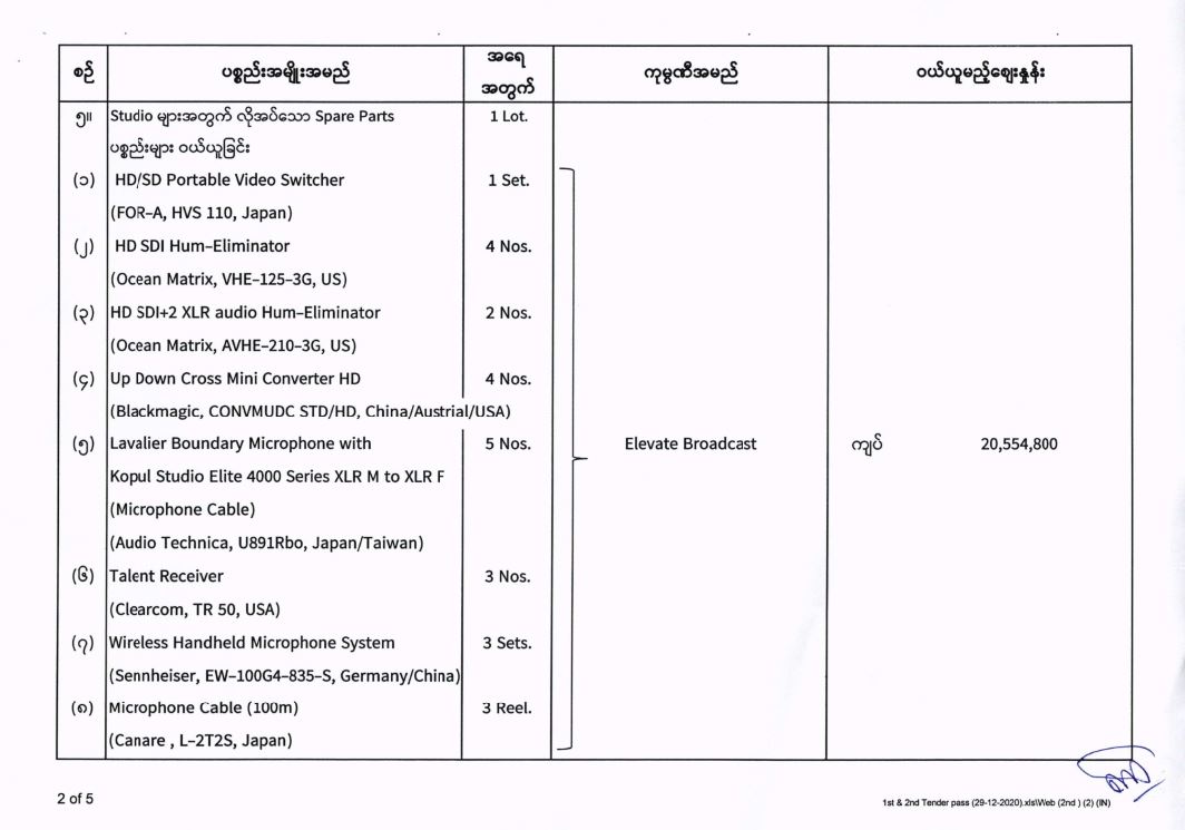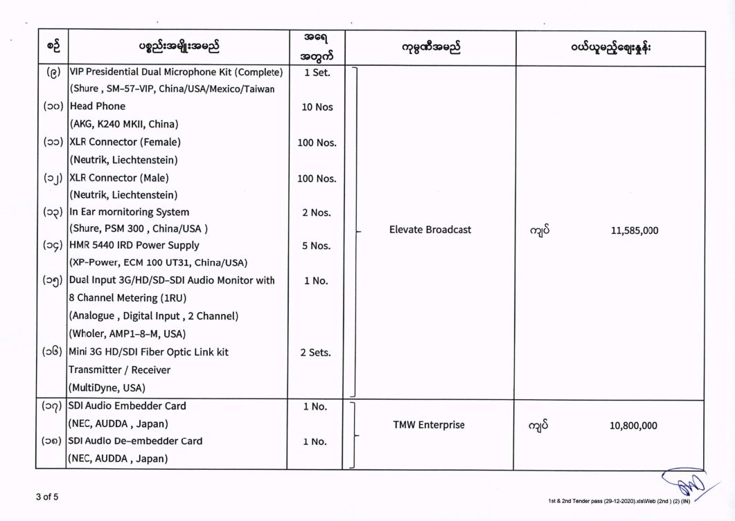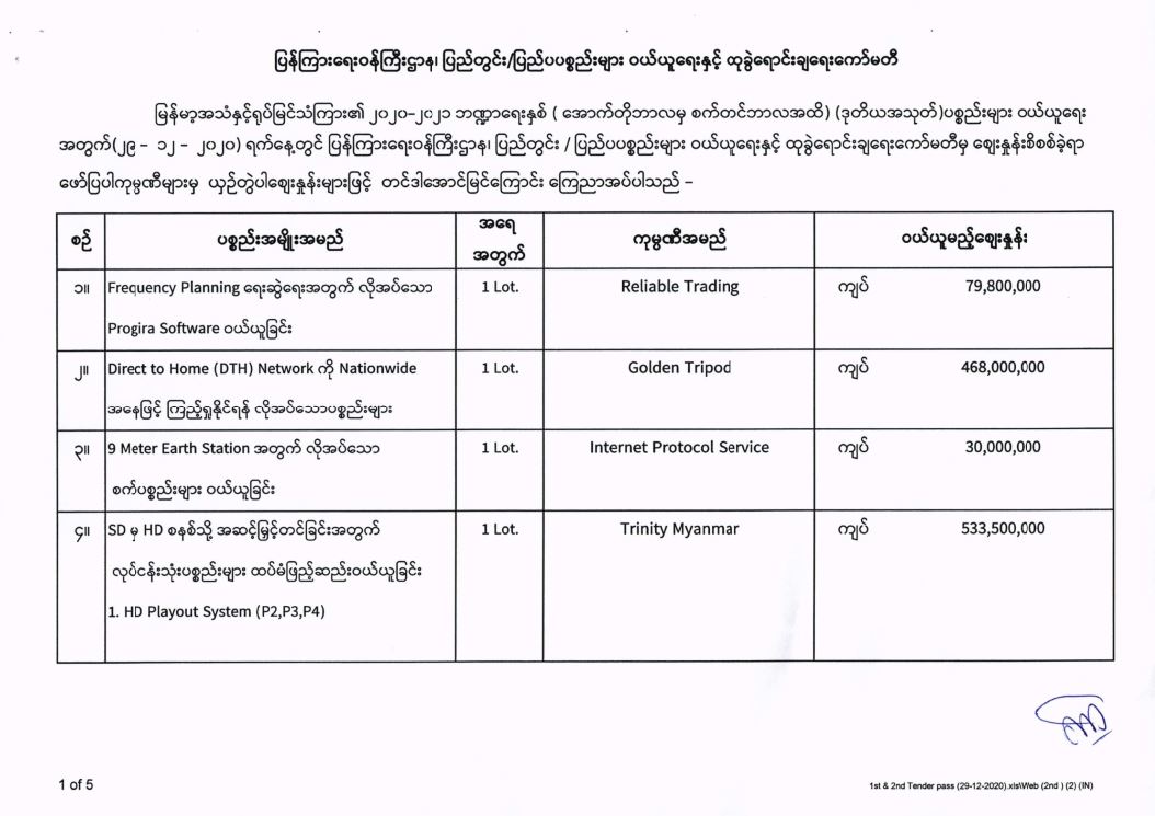 မြန်မာ့အသံနှင့်ရုပ်မြင်သံကြား၏ ၂၀၂၀-၂၀၂၁ ဘဏ္ဍာရေးနှစ် (အောက်တိုဘာလမှ စက်တင်ဘာလအထိ) (ဒုတိယအသုတ်) ပစ္စည်းများ ဝယ်ယူရေးအတွက် (၂၉-၁၂-၂၀၂၀) ရက်နေ့တွင် ပြန်ကြားရေးဝန်ကြီးဌာန၊ ပြည်တွင်း/ပြည်ပ ပစ္စည်းများ ဝယ်ယူရေးနှင့် ထုခွဲရောင်းချရေး ကော်မတီမှ ဈေးနှုန်းစိစစ်ခဲ့ရာ ဖော်ပြပါကုမ္ပဏီများမှ ယှဉ်တွဲပါ ဈေးနှုန်းများဖြင့် တင်ဒါအောင်မြင်ကြောင်း ကြေညာအပ်ပါသည်-