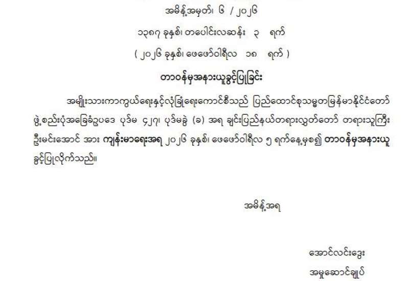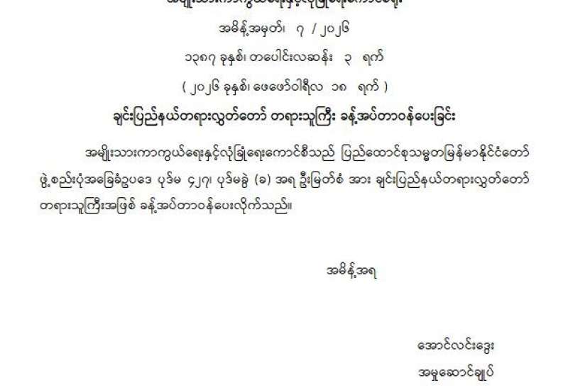 ချင်းပြည်နယ်တရားလွှတ်တော် တရားသူကြီး ခန့်အပ်တာဝန်ပေးခြင်း