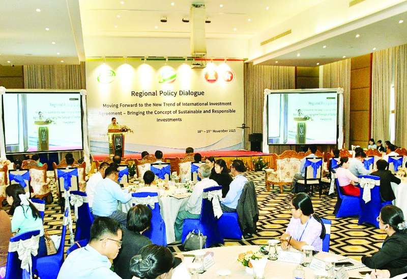 “နိုင်ငံတကာရင်းနှီးမြှုပ်နှံမှုသဘောတူစာချုပ်များ၏ ခေတ်သစ်တိုးတက်မှုလမ်းကြောင်းသို့ ဦးတည်ခြင်း - စဉ်ဆက်မပြတ်သော၊ တာဝန်ယူမှုရှိသော ရင်းနှီးမြှုပ်နှံမှု၏ အယူအဆကို ထည့်သွင်းခြင်း” ဒေသတွင်းအဆင့် မူဝါဒပိုင်းဆိုင်ရာဆွေးနွေးပွဲ ဖွင့်ပွဲအခမ်းအနားကို ယနေ့နံနက်ပိုင်းတွင် နေပြည်တော်ရှိ MGALLERY ဟိုတယ်၌ Hybrid စနစ်ဖြင့် ကျင်းပသည်။