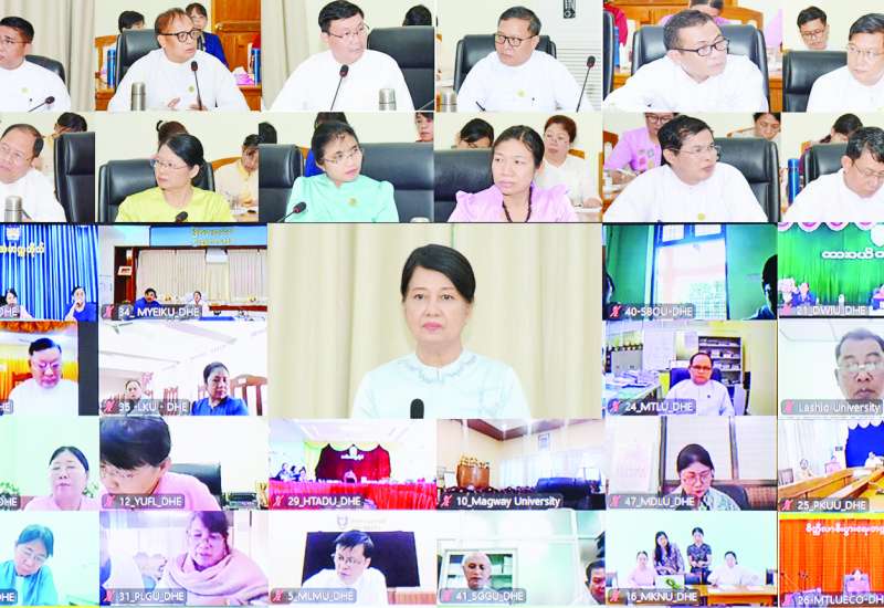 အင်္ဂလိပ်စာစွမ်းရည်မြင့်မားစေရေး တွေ့ဆုံဆွေးနွေးပွဲကို ယနေ့ညနေပိုင်းတွင် နေပြည်တော်ရှိ ပညာရေးဝန်ကြီးဌာန ရုံးအမှတ်(၁၃) အစည်းအဝေးခန်းမ၌ကျင်းပရာ ပညာရေးဝန်ကြီးဌာန ပြည်ထောင်စုဝန်ကြီး ဒေါက်တာချောချောစိန်၊ ဒုတိယဝန်ကြီး ဦးနေမျိုးလှိုင်၊ ညွှန်ကြားရေးမှူးချုပ်များ၊ အင်္ဂလိပ်စာ ဆရာ ဆရာမများနှင့် တာဝန်ရှိသူများတက်ရောက်ကြပြီး တက္ကသိုလ်များမှ ပါမောက္ခချုပ်များ၊ အင်္ဂလိပ်စာဌာနပါမောက္ခ(ဌာနမှူး)များက အွန်လိုင်းဖြင့် တက်ရောက်ကြသည်။