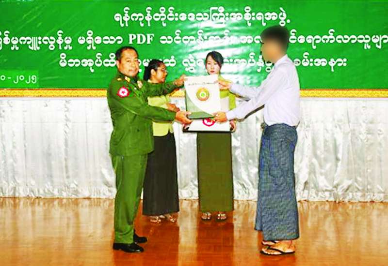 နိုင်ငံတော်အစိုးရသည်  PDF အပါအဝင် အဖွဲ့အစည်းအမျိုးမျိုး အမည်ခံ၍ လက်နက်ကိုင်ဆန့်ကျင် လျက်ရှိသည့််  အဖွဲ့အစည်းများ အတွင်း ရောက်ရှိနေသူများအား ဥပဒေဘောင်အတွင်းသို့ ပြန်လည် ဝင်ရောက်ရန် ဖိတ်ခေါ်၍ ဥပဒေဘောင်အတွင်းသို့ ပြန်လည်ဝင်ရောက်လာကြသူများကိုလည်း လိုအပ်သည့်ကူညီပံ့ပိုးမှုများ ဆောင်ရွက်ပေးလျက်ရှိရာ နိုင်ငံတော်နှင့်တပ်မတော်၏ ငြိမ်းချမ်းရေးလုပ်ငန်းစဉ်များကို နားလည် သဘောပေါက်လာသည့်  PDF အမည်ခံအဖွဲ့မှ အဖွဲ့ဝင် အမျိုးသား ၁၂ ဦးနှင့် အမျိုးသမီး သုံးဦးတို့သည်  ယနေ့တွင်  ဥပဒေဘောင်အတွင်းသို့ ထပ်မံဝင်ရောက်လာကြသည်။