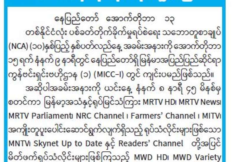 တစ်နိုင်ငံလုံးပစ်ခတ်တိုက်ခိုက်မှုရပ်စဲရေးသဘောတူစာချုပ် (NCA) (၁၀) နှစ်ပြည့် နှစ်ပတ်လည်နေ့ အခမ်းအနား MRTV မှ တိုက်ရိုက်ထုတ်လွှင့်မည်