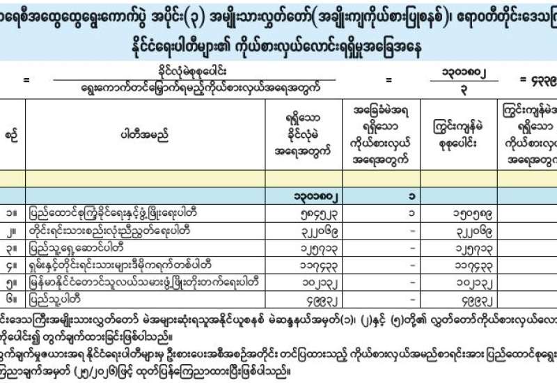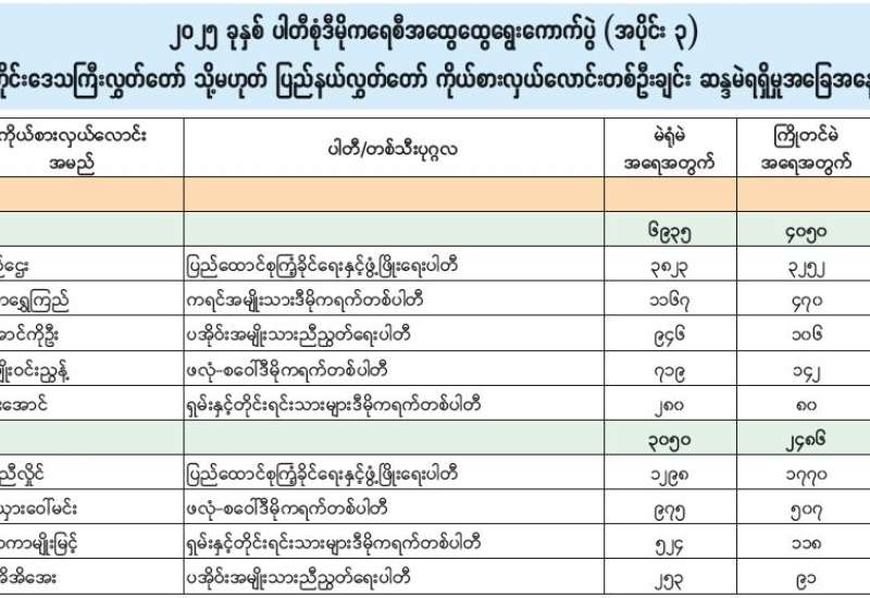 အမျိုးသားလွှတ်တော် (အချိုးကျကိုယ်စားပြုစနစ်)၊ ဧရာဝတီတိုင်းဒေသကြီးမဲဆန္ဒနယ်အမှတ် (၂) နိုင်ငံရေးပါတီများ၏ ကိုယ်စားလှယ်လောင်းရရှိမှုအခြေအနေ