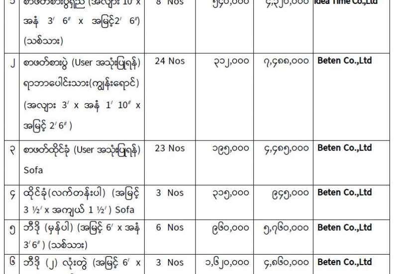 ပုံနှိပ်ရေးနှင့်ထုတ်ဝေရေးဦးစီးဌာနအတွက် ၂ဝ၂၅-၂ဝ၂၆ ဘဏ္ဍာရေးနှစ်၊ ငွေလုံးငွေရင်းအသုံးစရိတ်ဖြင့် ရုံးသုံး/ လုပ်ငန်းသုံးပရိဘောဂပစ္စည်း (၂၉) မျိုးမှ ပစ္စည်း (၂၃)မျိုးအား ဝယ်ယူရန် ပြည်တွင်း/ပြည်ပ ပစ္စည်းများ ဝယ်ယူရေးနှင့်ထုခွဲရောင်းချရေးကော်မတီမှ (၁၄-၈-၂ဝ၂၅) ရက် နံနက် (၁ဝ : ဝဝ) နာရီတွင် စိစစ်ခဲ့သည့် ဈေးနှုန်းများအနက် အနည်းဆုံးပေးသွင်းသည့် အောက်ပါကုမ္ပဏီများမှ ယှဉ်တွဲပါဈေးနှုန်း၊ အရေအတွက်တို့ဖြင့် တင်ဒါအောင်မြင်ကြောင်း ပြန်ကြားရေးဝန်ကြီးဌာန၊ စီမံခန့်ခွဲရေးကော်မတီ အစည်းအဝေးအမှတ်စဉ် (၁၂/၂ဝ၂၅) ဆုံးဖြတ်ချက်အရ ကြေညာအပ်ပါသည်-