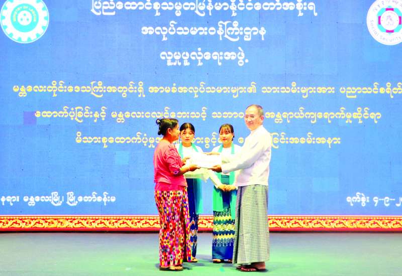 မန္တလေးတိုင်းဒေသကြီးအတွင်းရှိ အာမခံအလုပ်သမားများ၏ သားသမီးများအား ပညာသင်စရိတ်ထောက်ပံ့ခြင်းနှင့် မန္တလေးငလျင်ဘေးသင့် သဘာဝဘေးအန္တရာယ် ကျရောက်မှုဆိုင်ရာ မိသားစုထောက်ပံ့မှု အကျိုးခံစားခွင့်များပေးအပ်ခြင်း အခမ်းအနားကို ယနေ့နံနက်ပိုင်းက မန္တလေးမြို့ မြို့တော်ခန်းမ၌ကျင်းပရာ အလုပ်သမားဝန်ကြီးဌာန ပြည်ထောင်စုဝန်ကြီး ဦးအောင်ကျော်ဟိုး၊ တိုင်းဒေသကြီးဝန်ကြီးများ၊ ဌာနဆိုင်ရာတာဝန်ရှိသူများ၊ အရာထမ်း၊ အမှုထမ်းများ၊ အလုပ်ရှင်၊ အလုပ်သမားကိုယ်စားလှယ်များ တက်ရောက်ကြသည်။
