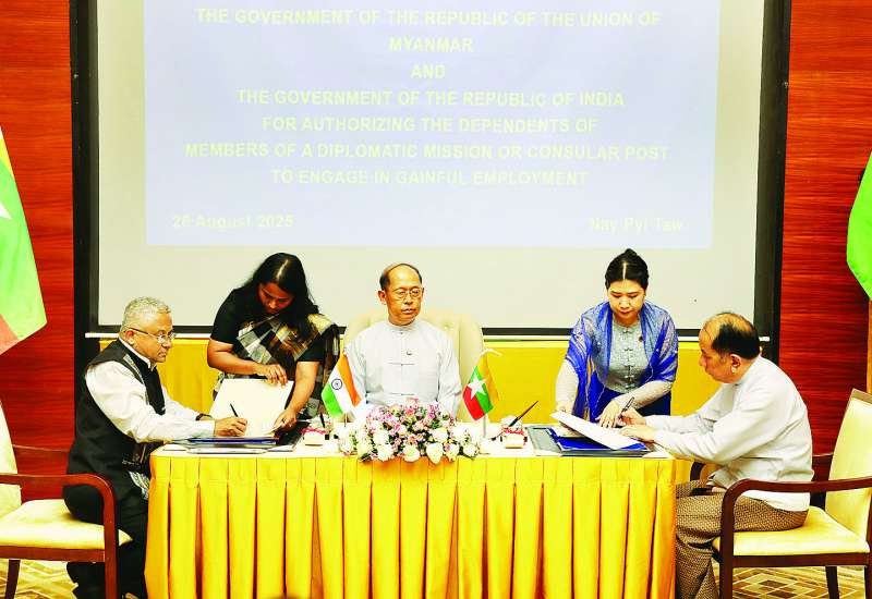 ပြည်ထောင်စုသမ္မတမြန်မာနိုင်ငံတော်အစိုးရနှင့် အိန္ဒိယသမ္မတ နိုင်ငံအစိုးရတို့အကြား သံအဖွဲ့သို့မဟုတ် ကောင်စစ်ဝန်ရုံးတို့မှ အဖွဲ့ဝင်များ၏ မှီခိုသူမိသားစုဝင်များကို အကျိုးအမြတ်ရှိသော အလုပ်အကိုင်များတွင် လုပ်ကိုင်ခွင့်ပြုခြင်း သဘောတူညီချက် လက်မှတ်ရေးထိုးပွဲ အခမ်းအနားကို ယနေ့တွင်နေပြည်တော်ရှိ Park Royal ဟိုတယ်၌ ကျင်းပသည်။