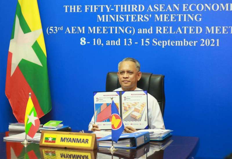 (၅၃) ကြိမ်မြောက် အာဆီယံစီးပွားရေးဝန်ကြီးများ အစည်းအဝေး ဒုတိယနေ့ကို ဗီဒီယို ကွန်ဖရင့်စနစ်ဖြင့် ဆက်လက်ကျင်းပခဲ့ရာ ရင်းနှီးမြှုပ်နှံမှုနှင့် နိုင်ငံခြားစီးပွားဆက်သွယ်ရေး ဝန်ကြီးဌာန၊ ပြည်ထောင်စုဝန်ကြီး ဦးအောင်နိုင်ဦးသည် နေပြည်တော်ရှိ ရင်းနှီးမြှုပ်နှံမှုနှင့် နိုင်ငံခြားစီးပွား ဆက်သွယ်ရေးဝန်ကြီးရုံးမှ ပါဝင်တက်ရောက်သည်။