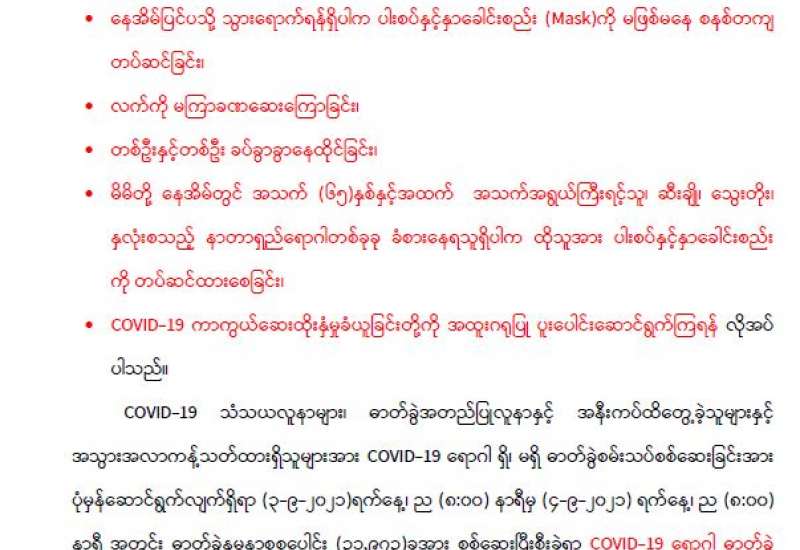 ပြည်သူလူထုအတွင်း ကိုဗစ်-၁၉ ရောဂါ ကူးစက်မှုမရှိစေရေးအတွက် ကျန်းမာရေးဝန်ကြီးဌာနက ထုတ်ပြန်ထားသည့် ကိုဗစ်-၁၉ရောဂါ ကာကွယ် ထိန်းချုပ်ရေး အမိန့်ကြေညာချက်များ၊ ညွှန်ကြားချက်များ၊ လုပ်ငန်းလမ်းညွှန်များအတိုင်းတိကျစွာ လိုက်နာဆောင်ရွက်သွားရန် အထူးအရေးကြီးကြောင်း ကျန်းမာရေးဝန်ကြီးဌာနက သတင်း ထုတ်ပြန်တိုက်တွန်းထားသည်။