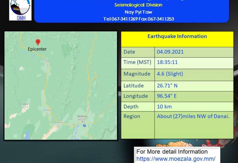 ၂၀၂၁ ခုနှစ်၊ စက်တင်ဘာလ (၄)ရက်နေ့၊ မြန်မာစံတော်ချိန် (၁၈)နာရီ၊ (၃၅)မိနစ်၊ (၁၁)စက္ကန့် အချိန်တွင် မြစ်ကြီးနားမြေငလျင်စခန်းမှ အနောက်မြောက်ဘက် မိုင်(၁၀၀) ခန့်ကွာဝေးသော မြန်မာနိုင်ငံပြည်တွင်း (တနိုင်းမြို့၏ အနောက်မြောက်ဘက် (၂၇)မိုင်ခန့်အကွာ)၊ မြောက်လတ္တီတွဒ် (၂၆.၇၁)ဒီဂရီ၊ အရှေ့လောင်ဂျီတွဒ် (၉၆.၅၄)ဒီဂရီ၊ အနက် (၁၀)ကီလိုမီတာကို ဗဟိုပြု၍ အင်အား ရစ်(ခ်)တာစကေး (၄.၆)အဆင့်ရှိ အင်အားအနည်းငယ်ရှိသော မြေငလျင်တစ်ခု လှုပ်ရှားသွားကြောင်း တိုင်းထွာရရှိပါသည်။
