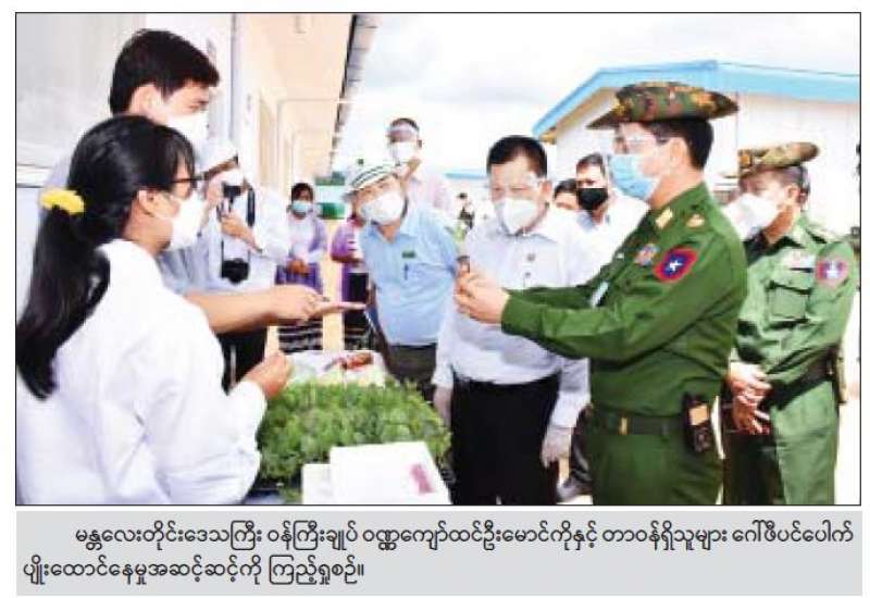 ကိုဗစ်-၁၉ ရောဂါ ကာကွယ်၊ထိန်းချုပ်၊ ကုသရေးလုပ်ငန်းများ အရှိန်အဟုန်မြှင့်ဆောင်ရွက်လျက်ရှိပြီး ရန်ကုန်တိုင်းစစ်ဌာနချုပ်နယ်မြေအတွင်းရှိ ကုသရေး ဆေးရုံများ၌ ကျန်းမာရေးဝန်ထမ်းများ မလုံလောက်မှုကြောင့် ထပ်မံဖွင့်လှစ်ထားရှိသည့် ရန်ကုန်တိုင်းဒေသကြီး၊ လှည်းကူးမြို့နယ်၊ ကိုဗစ်-၁၉ ရောဂါ ကုသရေးဌာန (ဖောင်ကြီး)တွင် တပ်မတော်မှ ပါဝင်ကူညီ ဆောင်ရွက်ရန်အတွက် ဆေးဝန်ထမ်းတပ်ဖွဲ့ဝင် ပါရဂူများ၊ ဆေးမှူးများ၊ သူနာပြုများ ပါဝင်သော အဖွဲ့က သွားရောက် တာဝန်ထမ်းဆောင်လျက်ရှိသည်။