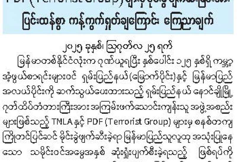 ဩဂုတ်လ ၂၄ ရက်နေ့က ရှမ်းပြည်နယ်မြောက်ပိုင်း နောင်ချိုမြို့နယ်နှင့် ကျောက်မဲမြို့နယ်တို့ကို ဆက်သွယ်ဖြတ်သန်းဖောက်လုပ်ထားသော ကမ္ဘာကျော်ဂုတ်ထိပ်တံတားကြီးကို ဖောက်ခွဲဖျက်ဆီးလိုက်သည့် သတင်းနှင့် ဓာတ်ပုံများကို မြင်တွေ့ကြရသဖြင့် တိုင်းရင်းသားပြည်သူအားလုံး စိတ်မကောင်းခြင်းများစွာ ဖြစ်ကြရသည့်အပြင် ကမ္ဘာကျော်တံတားကြီးကို ဖျက်ဆီးခဲ့ကြသည့် အကြမ်းဖက်သောင်းကျန်းသူများအား ကန့်ကွက်ရှုတ်ချ စက်ဆုပ်ရွံရှာဖြစ်နေကြသည်ဟု သိရသည်။