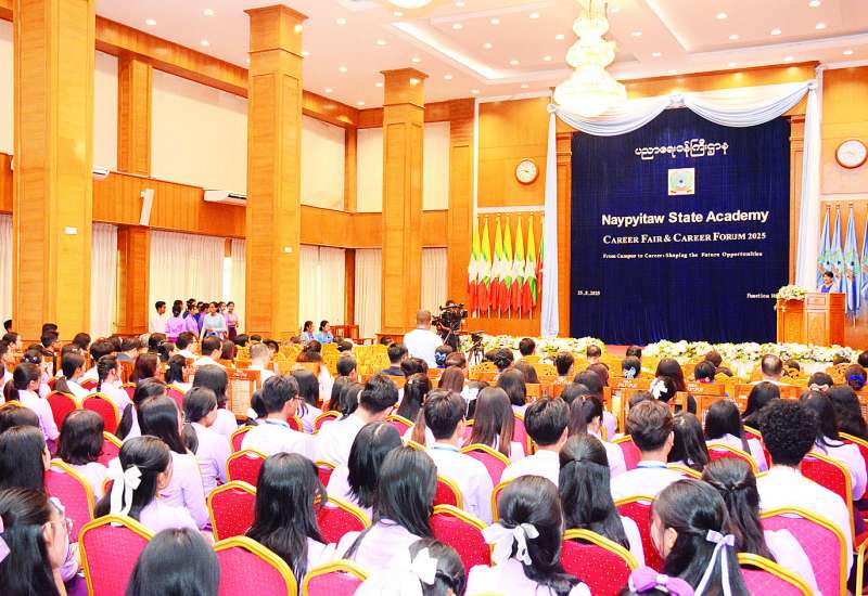 ပထမအကြိမ် Career Fair & Career Forum 2025 ကို ယနေ့ နံနက် ၉ နာရီတွင် Naypyitaw State Academy ၌ ကျင်းပရာ ပညာရေးဝန်ကြီးဌာန ပြည်ထောင်စုဝန်ကြီး ဒေါက်တာချောချောစိန်၊ ဒုတိယဝန်ကြီး ဒေါက်တာဇော်မြင့်နှင့် ဦးနေမျိုးလှိုင်၊ တာဝန်ရှိသူများ၊ ခေတ္တပါမောက္ခချုပ်၊ ဆရာ ဆရာမများ၊ ကျောင်းသား ကျောင်းသူများ၊ လုပ်ငန်းရှင်များနှင့် ဖိတ်ကြားထားသူများ တက်ရောက်ကြသည်။
