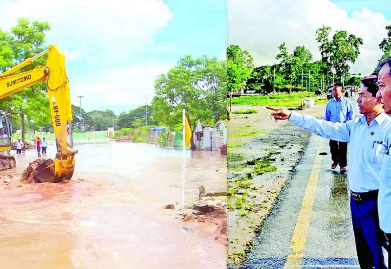 စိုက်ပျိုးရေး၊ မွေးမြူရေးနှင့်ဆည်မြောင်းဝန်ကြီးဌာန ပြည်ထောင်စုဝန်ကြီး ဦးမင်းနောင်သည် ဒုတိယဝန်ကြီး ဦးဗိုလ်ဗိုလ်ကျော်၊ တာဝန်ရှိသူများနှင့်အတူ ယနေ့နံနက်ပိုင်းက နရဘန်ချောင်းရေလျှံတက်၍ ရေကြီးမှုနှင့် လမ်းရေကျော်ကျမှုများ၊ ရေစီးရေလာကောင်းမွန်ရေး ပင်လောင်းလမ်းဖြတ်သည့် နရဘန်ချောင်း Box Culvert ရှင်းလင်းခြင်း၊ သစ်တပ်ရွာအနီး ရန်ကုန်-မန္တလေးလမ်းအရှေ့ဘက်မှ ပြောင်းရွှေ့တူးဖော်နေသည့် မပိုက်ကယ်ရိုးမှ ရေကူစီးဆင်းစေခြင်း၊ ကျဉ်းမြောင်းနေသည့် ယာယီ Culvert များနှင့် ရေသွားလမ်းအား စက်ယန္တရားများဖြင့် ဖယ်ရှားခြင်းနှင့် ရေသွားလမ်းချဲ့ခြင်းများကို ကြည့်ရှုစစ်ဆေးသည်။