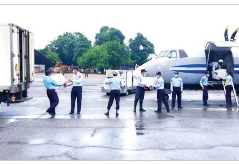 ရန်ကုန်မြို့ မင်းဓမ္မလမ်းရှိ တိုးချဲ့ ကာကွယ်ဆေးသိုလှောင်ခန်းတွင် ထားရှိသည့် ကိုဗစ်ရောဂါကာကွယ်ဆေးများကို စံချိန် စံညွှန်းများအတိုင်း တိုင်းဒေသ ကြီးနှင့် ပြည်နယ်အသီးသီးသို့ တပ်မတော်လေယာဉ်များ၊ Cold Chain Delivery Logistics တော်ယာဉ်ကြီးများဖြင့် ပို့ဆောင် ဖြန့်ဖြူးပေးလျက်ရှိသည်။