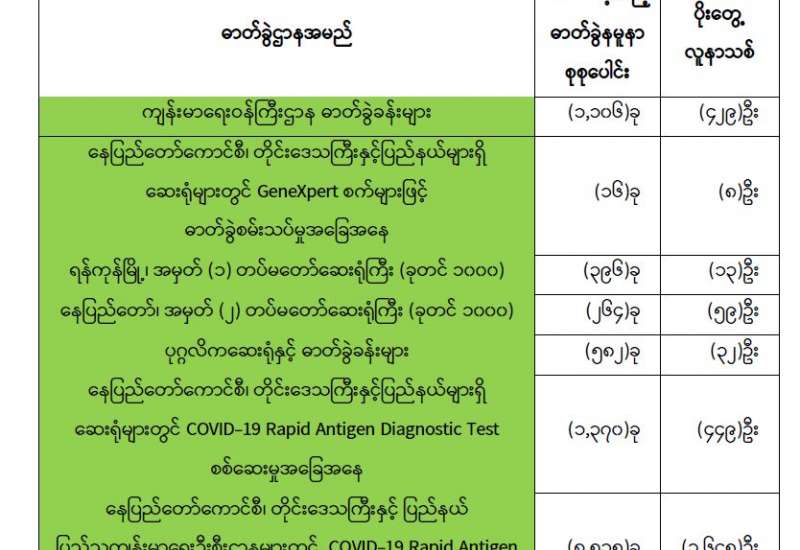 ကျန်းမာရေးဝန်ကြီးဌာနအနေဖြင့် နိုင်ငံအတွင်း ကူးစက်ဖြစ်ပွားနေသော COVID-19 ရောဂါကာကွယ်၊ ကုသ၊ ထိန်းချုပ်ရေးလုပ်ငန်းများကို အရှိန်အဟုန်မြှင့်ဆောင်ရွက်လျက်ရှိရာ ရောဂါထိန်းချုပ်ရေးလုပ်ငန်းများ အောင်မြင်နိုင်ရေးအတွက် ပြည်သူလူထုအနေဖြင့် -