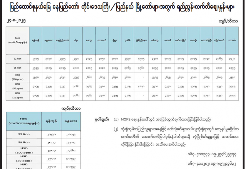 ရန်ကုန်မြို့နှင့် မန္တလေးမြို့အတွက် ရည်ညွှန်းလက်ကားဈေးနှုန်းများနှင့် ပြည်ထောင်စုနယ်မြေ နေပြည်တော်၊ တိုင်းဒေသကြီး/ပြည်နယ် မြို့တော်များအတွက် ရည်ညွှန်းလက်လီစျေးနှုန်းများ