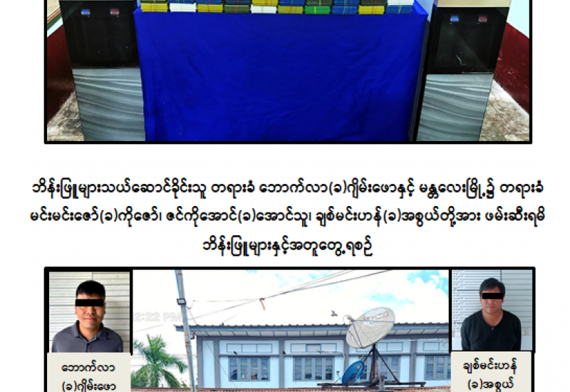 မူးယစ်ဆေးဝါးတားဆီးနှိမ်နင်းရေးရဲတပ်ဖွဲ့မှ တပ်ဖွဲ့ဝင်များပါဝင်သော ပူးပေါင်းအဖွဲ့သည် သတင်းအရ ဩဂုတ်လ ၇ ရက်နေ့ ည ၈ နာရီခွဲအချိန် တောင်ကြီးမြို့ ၊ အေးသာယာကားကြီးဝင်းတွင် မူဆယ်မြို့နေ သိန်းထွန်းဦး(ခ)ဘိုဘိုမှ မန္တလေးသို့ လူမဲ့တန်ဆာဖြင့်တင်ပို့မည့် WATER COOLER ၈ လုံးအား ဖွင့်ဖောက်စစ်ဆေးခဲ့ရာ WATER COOLER များအတွင်းမှ ပလတ်စတစ်ဆပ်ပြာခွက်များဖြင့် ထည့်ထားသည့် ဘိန်းဖြူ ၇ ဒသမ ၀၂ ကီလို (၎င်းဒေသတန်ဖိုး ငွေကျပ် ၁,၀၅၃ သိန်း)အား တွေ့ရှိဖမ်းဆီးရမိခဲ့ပြီး ၎င်း၏ဖော်ထုတ်ချက်အရ အလားတူ WATER COOLER များအတွင်း ဘိန်းဖြူများထည့်သွင်း၍ ကားဂိတ်များမှတစ်ဆင့် လူမဲ့တန်ဆာဖြင့် စစ်ကိုင်းတိုင်းဒေသကြီး၊