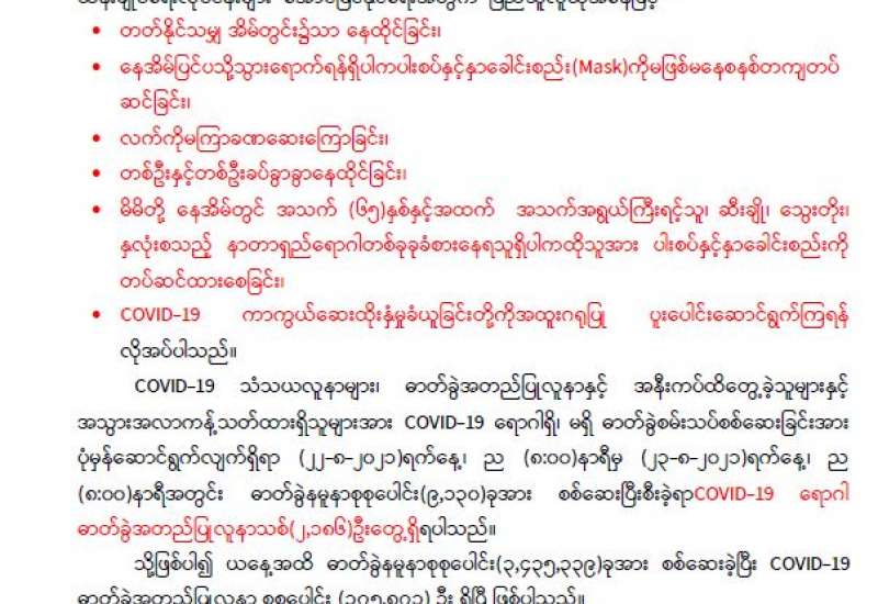 တိုင်းဒေသကြီးနှင့် ပြည်နယ်အသီးသီးရှိ ထေရ်ကြီးဝါကြီး ဆရာတော်ကြီးများ အပါအဝင် လူမျိုးမရွေး၊ ဘာသာမရွေး အသက်(၆၅)နှစ်အထက် သက်ကြီး ဘိုးဘွားများ၊ ဌာနဆိုင်ရာဝန်ထမ်းများ၊ တိုင်းရင်းသား ပြည်သူများနှင့် အကျဉ်းထောင်များ၌ ပြစ်ဒဏ်ကျခံနေသည့် အကျဉ်းသား၊ အကျဉ်းသူများအား ကိုဗစ်- ၁၉ ရောဂါ ကာကွယ်ဆေးထိုးနှံနိုင်ရေးအတွက် ဆေးနှင့်ဆေးပစ္စည်းများကို တပ်မတော် လေယာဉ် များ ဖြင့် သယ်ယူပို့ဆောင်ပေးခြင်းများနှင့် ကာကွယ်ဆေးထိုးနှံပေးခြင်းများကို ဝိုင်းဝန်း ကြိုးပမ်းဆောင်ရွက် လျက်ရှိသည်။
