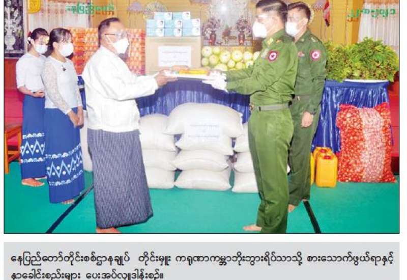 ကိုဗစ်- ၁၉ ရောဂါ ကာကွယ်၊ ထိန်းချုပ်၊ ကုသရေးလုပ်ငန်းများကို အရှိန်အဟုန်မြှင့် ဆောင်ရွက် လျက်ရှိရာ သွားလာမှုကန့်သတ်ချက်များကြောင့် စစ်မှုထမ်းဟောင်း အဖွဲ့ဝင်များ၊ မြန်မာနိုင်ငံ ရဲတပ်ဖွဲ့ဝင်များ၊ ပြည်သူ့စစ်(ဌာနေ)တပ်ဖွဲ့ဝင်များ၊ ကျန်းမာရေးဝန်ထမ်းများ၊ စေတနာ့ဝန်ထမ်း Volunteerများနှင့် ဒေသခံပြည်သူများ စားရေးအဆင်ပြေစေရေးအတွက် တပ်မတော်နှင့် စေတနာရှင် အလှူရှင်များက စားသောက်ဖွယ်ရာများ၊ ထောက်ပံ့ငွေများနှင့် ရောဂါကာကွယ်ရေးအထောက်အကူပြု ပစ္စည်းများကို ထောက်ပံ့လှူဒါန်းလျက်ရှိသည်။