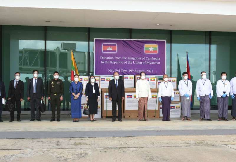 မြန်မာနိုင်ငံ၏ ကိုဗစ်-၁၉ ရောဂါ ကာကွယ်၊ ထိန်းချုပ်၊ ကုသရေးလုပ်ငန်းများတွင် အသုံးပြုရန် အတွက် ကမ္ဘောဒီးယားနိုင်ငံအစိုးရနှင့် ပြည်သူများက အထောက်အကူပြု ဆေးပစ္စည်းများ လှူဒါန်းခြင်း အခမ်းအနားကို ယနေ့နံနက်ပိုင်းတွင် နေပြည်တော် အပြည် ပြည်ဆိုင်ရာလေဆိပ် ၌ကျင်းပသည်။
