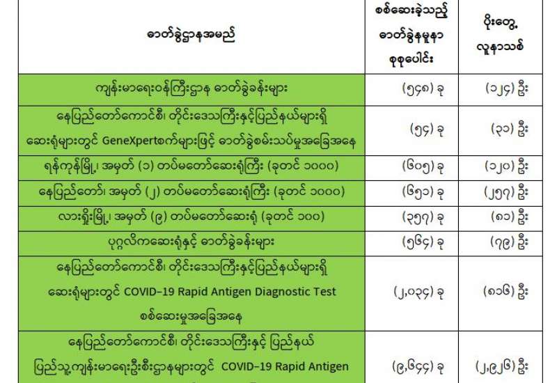 (၉-၈-၂၀၂၁) ရက်နေ့၊ ည (၈:၀၀) နာရီမှ (၁၀-၈-၂၀၂၁) ရက်နေ့၊ ည (၈:၀၀) နာရီအတွင်း ဓာတ်ခွဲနမူနာစုစုပေါင်း (၁၄,၄၅၇) ခုအား စစ်ဆေးပြီးစီးခဲ့ရာ COVID-19 ရောဂါ ဓာတ်ခွဲ အတည်ပြု လူနာသစ် (၄,၄၃၄) ဦး တွေ့ရှိရပါသည်။ သို့ဖြစ်ပါ၍ ယနေ့အထိ ဓာတ်ခွဲနမူနာ စုစုပေါင်း (၃,၂၈၄,၂၃၇) ခု အား စစ်ဆေးခဲ့ပြီး COVID-19 ဓာတ်ခွဲအတည်ပြုလူနာ စုစုပေါင်း (၃၃၇,၅၆၁) ဦး ရှိပြီဖြစ်ပါသည်။