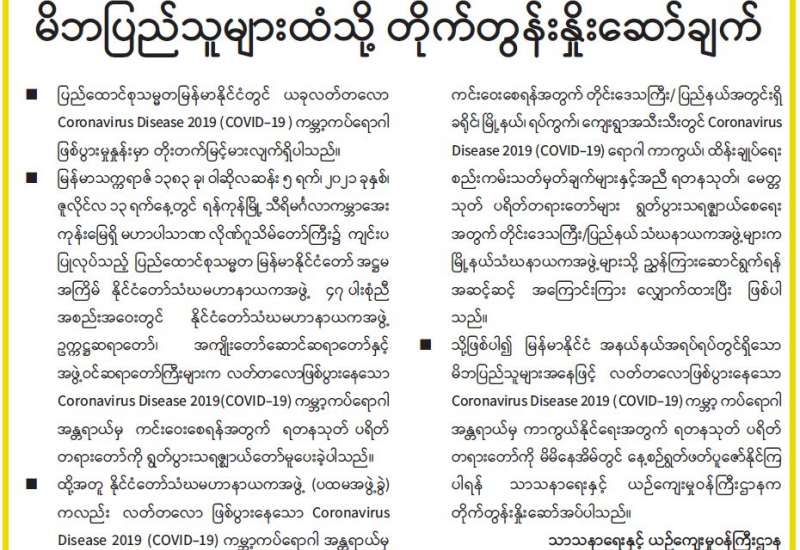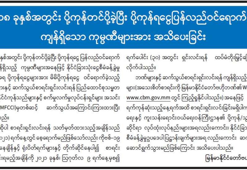 နိုင်ငံတော်အတွင်း၌ ကိုဗစ်-၁၉ ကာကွယ်၊ ထိန်းချုပ်၊ ကုသရေးလုပ်ငန်းများအတွက် အရေးတကြီး လိုအပ် လျက်ရှိသည့် အောက်ဆီဂျင်အရည်၊ အောက်ဆီဂျင် ဓာတ်ငွေ့၊ အိမ်သုံးအောက်ဆီဂျင်စက်၊ ဆေးဝါး နှင့် ဆက်စပ်ပစ္စည်းများ ပြတ်လပ်မှုမရှိစေရန် အများပြည်သူ ရုံးပိတ်ရက်များတွင် လေကြောင်း၊ ရေကြောင်းနှင့် နယ်စပ်ကုန်သွယ်ရေးစခန်းများမှ စဉ်ဆက်မပြတ် တင်သွင်းနိုင်ရေးအတွက် စီးပွားရေးနှင့် ကူးသန်းရောင်းဝယ်ရေးဝန်ကြီးဌာနမှ ဆောင်ရွက်ပေးလျက်ရှိသည်။