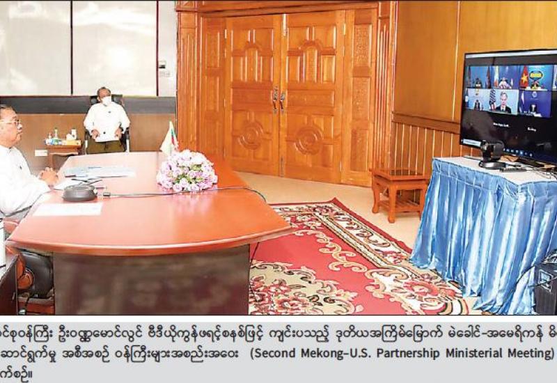 နိုင်ငံခြားရေးဝန်ကြီးဌာန ပြည်ထောင်စုဝန်ကြီး ဦးဝဏ္ဏမောင်လွင်သည် ယနေ့ နံနက်ပိုင်းတွင် ဗီဒီယိုကွန်ဖရင့်စနစ်ဖြင့် ကျင်းပသည့် ဒုတိယ အကြိမ်မြောက် မဲခေါင်-အမေရိကန် မိတ်ဖက်ပြု ပူးပေါင်းဆောင်ရွက်မှု အစီအစဉ် ဝန်ကြီးများအစည်းအဝေး(Second Mekong-U.S. Partnership Ministerial Meeting) သို့ နေပြည်တော်ရှိ နိုင်ငံခြားရေး ဝန်ကြီးဌာနမှ ပါဝင်တက်ရောက်သည်။