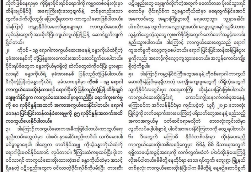ကိုဗစ်-၁၉ ရောဂါ ဖြစ်ပွားမှုကြောင့် တစ်ကမ္ဘာလုံးတွင် အခက်အခဲများရင်ဆိုင်ရလျက်ရှိပြီး ကုန်ထုတ်လုပ်မှုကိစ္စရပ်များနှင့်ပတ်သက်၍ စား၍ကုန်သည့်ပစ္စည်း၊ သုံး၍ကုန်သည့်ပစ္စည်း၊ သောက်၍ကုန်သည့်ပစ္စည်း စသည့်စားသောက်သုံးကုန်ပစ္စည်းများ ထုတ်လုပ်မှုနှင့်ပတ်သက်၍ ကန့်သတ်မှုများ ပြုလုပ်မထားကြောင်း၊ စားရေးသည်အဓိကဖြစ်၍ အခက်အခဲမရှိအောင် လုပ်ဆောင်ပေးကြရမည်ဖြစ်ကြောင်း၊ individual လုပ်ကိုင်သည့် ကုန်ထုတ်လုပ်ငန်းများကို အဆက်မပြတ်လုပ်ကိုင်ကြရန် လိုကြောင်း၊ ထို့အပြင် ကျန်းမာရေးနှင့်ပတ်သက်သည့် လိုက်နာရမည့်အသိပေးချက်။ သတိပေးချက်များကိုလည်း ပြည်သူများ သိရှိစေရန်၊ လိုက်နာစေရန် မကြာခဏ ပြောဆိုသတိပေးနေရန် လိုအပ်မည်ဖြစ်ကြောင်း နိုင်ငံတော်စီမံအုပ်ချုပ်ရေး ကောင်စီဥက္ကဋ္ဌ က ကိုဗစ်-၁၉ ရောဂါ ကာကွယ်၊ ထိန်းချုပ်၊ ကုသရေးဆိုင်ရာ ပဉ္စမအကြိမ် ညှိနှိုင်းအစည်းအဝေးတွင် ပြောကြားခဲ့သည်။