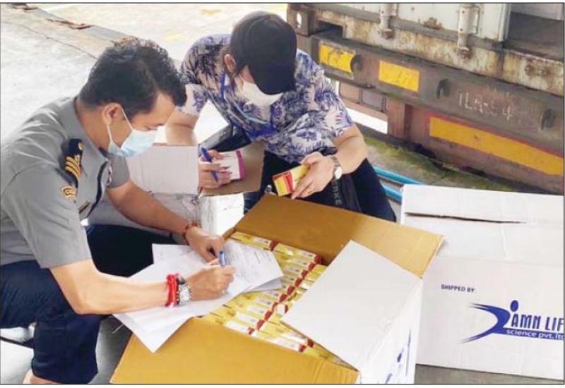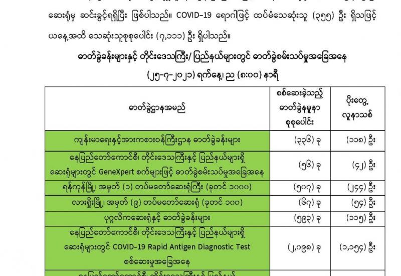 အကောက်ခွန်ဦးစီးဌာနအနေဖြင့် ကိုဗစ်-၁၉ ရောဂါ ကာကွယ်ထိန်းချုပ်၊ ကုသရေး၊ ဆေးနှင့် ဆေးပစ္စည်းများအား လေကြောင်း၊ ဆိပ်ကမ်း၊ နယ်စပ်ဂိတ်အသီးသီးမှ ရုံးပိတ်ရက်ရှည်ကာလ အတွင်း နေ့စဉ်ရုံးပိတ်ရက် မရှိလွယ်ကူချောမွေ့စွာ စစ်ဆေးထုတ်ပေးလျက်ရှိရာ ၂၅-၇-၂၀၂၁ ရက်တွင် ရန်ကုန်အပြည်ပြည်ဆိုင်ရာ လေဆိပ်၌ ကုမ္ပဏီ ၉၄ ခုမှ Oxygen Concentrator ၂၆၇၆ ခု၊ Oximeter ၂၀၉၀ ၊ Oxygen Regulator ၁၅၉၀ ၊ NILRISE FAVIPIRAVIR TABLET ၁၀၀၊ Test Kit ၄၇၂၉၃ ခု၊ NasalCannula၁၂၀ ၊ Testing Reagent ၃၃၂၀၀ ၊ Flow Meter ၄၀၀ ၊