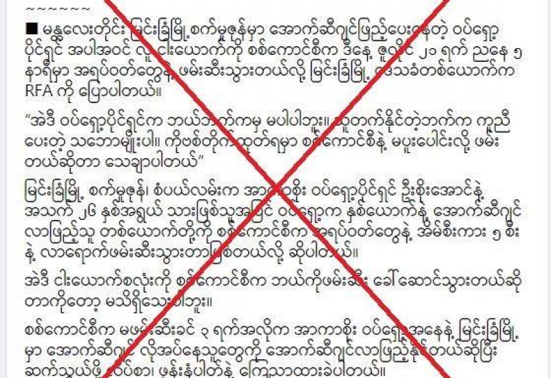 မြင်းခြံမြို့နယ် စက်မှုဇုန်ရှိ အောက်ဆီဂျင်ဖြည့်ပေးနေသော ဝပ်ရှော့ပိုင်ရှင် အပါအဝင် လူခြောက်ဦးကို လုံခြုံရေးတပ်ဖွဲ့ဝင်များက အရပ်ဝတ်များဖြင့် လာရောက်ဖမ်းဆီးသွားသည့် သတင်းအား RFA က ဖြစ်စဉ် အမှန်စိစစ်ခြင်း မရှိဘဲ ကျင့်ဝတ်မဲ့စွာ ထုတ်ပြန်ထား ကြောင်းသိရသည်။