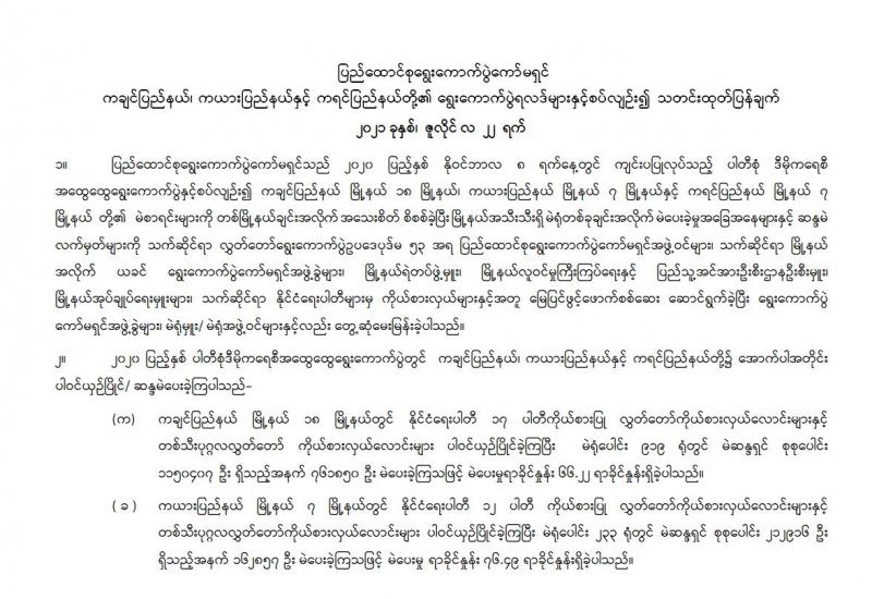 ကိုဗစ်-၁၉ ရောဂါ တတိယလှိုင်း ဖြစ်ပွားလျက်ရှိပြီး ရောဂါကူးစက်ပြန့်ပွားမှုမှာ နေ့စဉ်မြင့်တက်လျက်ရှိသောကြောင့် ရောဂါကူးစက်မှုမခံရစေရေးအတွက် နေပြည်တော်ကောင်စီ နယ်မြေ၊ ရှမ်းပြည်နယ်(မြောက်ပိုင်း)၊ လားရှိုးမြို့၊ ဧရာဝတီတိုင်းဒေသကြီး၊ ပုသိမ်မြို့နှင့် ပဲခူးတိုင်းဒေသကြီး၊ တောင်ငူမြို့များ၌