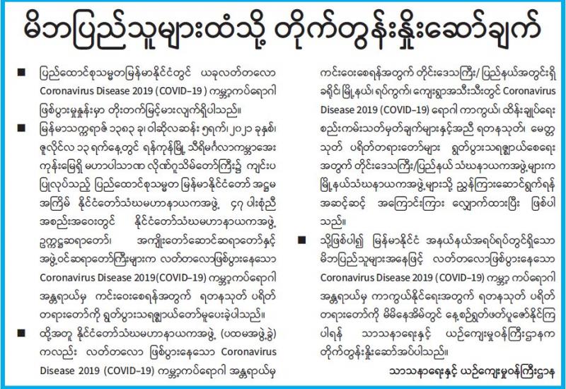 မြန်မာ့အသံနှင့် ရုပ်မြင်သံကြားမှ ဇူလိုင် ၂၀ ရက် ည ၈ နာရီ သတင်းအပြီးတွင် ထုတ်လွှင့်ပြသခဲ့သည့် ကိုဗစ် -၁၉ ရောဂါကာကွယ်ထိန်းချုပ် ရေးဆိုင်ရာဆောင်ရွက်ချက်များ အကြောင်း သိကောင်းစရာအစီအစဉ်ကို ပြည်သူများသိရှိနိုင်ရန်အတွက် ပြန်လည်ဖော်ပြလိုက်ပါသည်။
