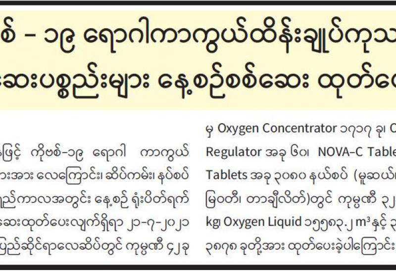 လက်ရှိအချိန်တွင် ကိုဗစ်-၁၉ ရောဂါ တတိယလှိုင်းဖြစ်ပွားမှု မြင့်တက် လျက်ရှိပြီး ဓာတ်ခွဲအတည်ပြုပိုးတွေ့လူနာများနှင့် သီးသန့်စောင့်ကြည့်ရမည့်သူများကို တပ်မတော်ဆေးရုံများ၊ ပြည်သူ့ဆေးရုံများ၊ ကျန်းမာရေးဌာနများနှင့် ကိုဗစ်စင်တာ များတွင် ကျန်းမာရေးစောင့်ရှောက်မှု လုပ်ငန်းများကို တပ်မတော်သား ဆရာဝန်များ၊ ကျန်းမာရေးဝန်ထမ်းများ၊ လူမှုရေးအသင်းအဖွဲ့များ ပူးပေါင်း၍ အင်တိုက်အားတိုက် ဆောင်ရွက်ပေးလျက်ရှိပြီး ထိုသို့ဆောင်ရွက်ပေးရာတွင် အထောက်အကူဖြစ်စေရန်အတွက် ကာကွယ်၊ ထိန်းချုပ်၊ ကုသရေးပစ္စည်းများ၊ အောက်ဆီဂျင်အိုးများနှင့် အာဟာရဖြည့်စားသောက်ဖွယ်ရာများကို တပ်မတော်က သွားရောက်ထောက်ပံ့လှူဒါန်းပေးလျက်ရှိသည်။